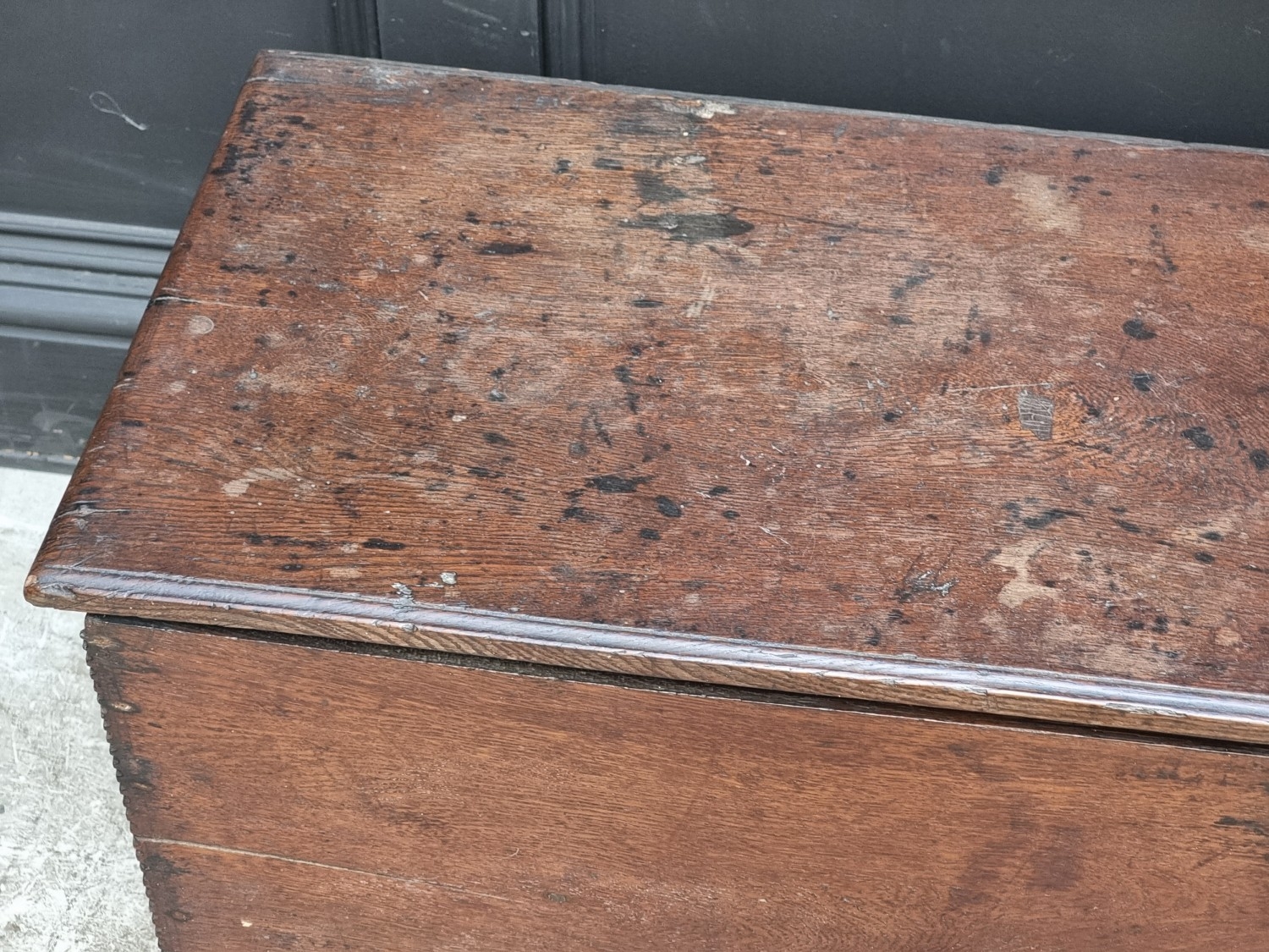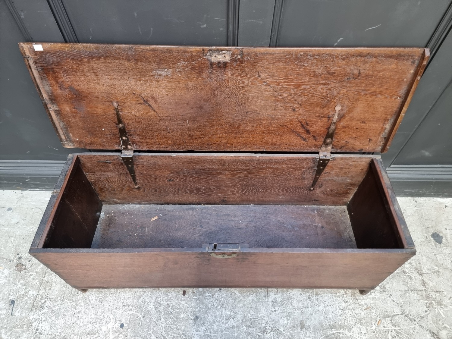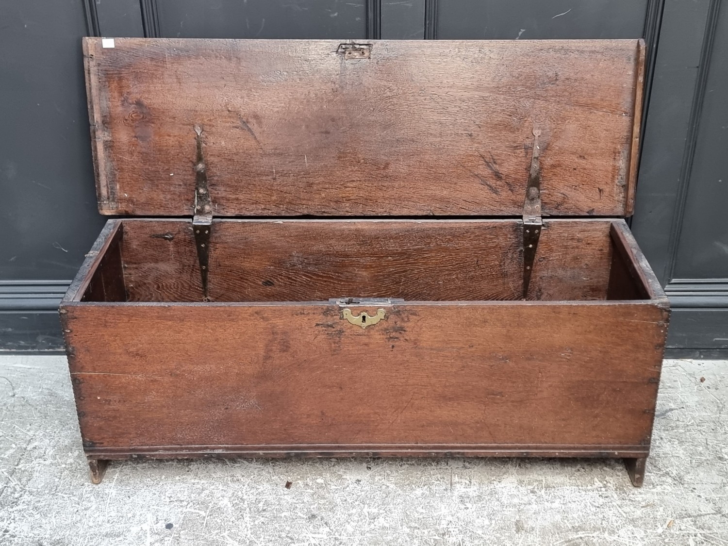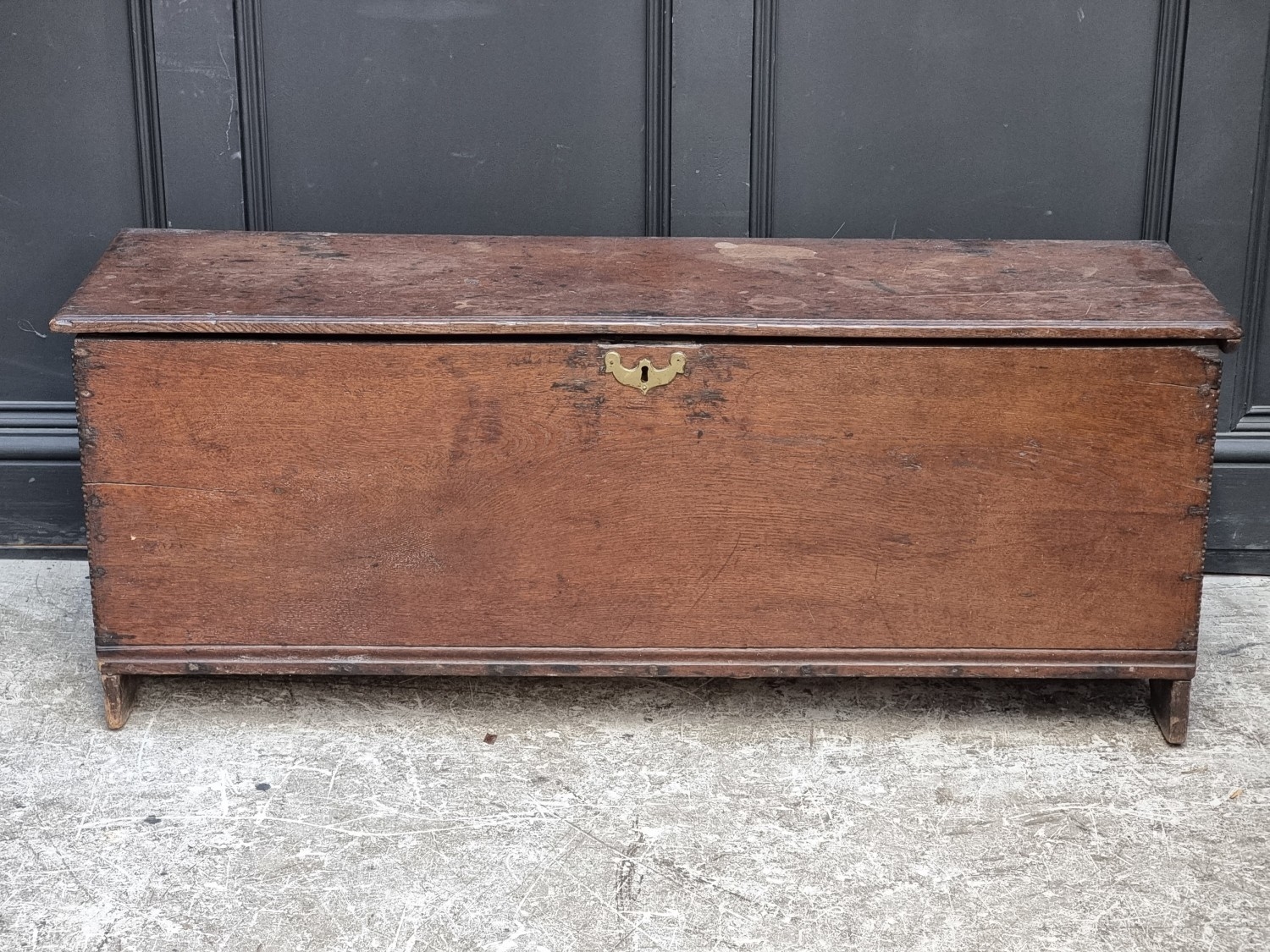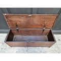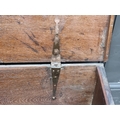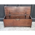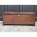 A late 17th century oak boarded coffer, 120cm wide.