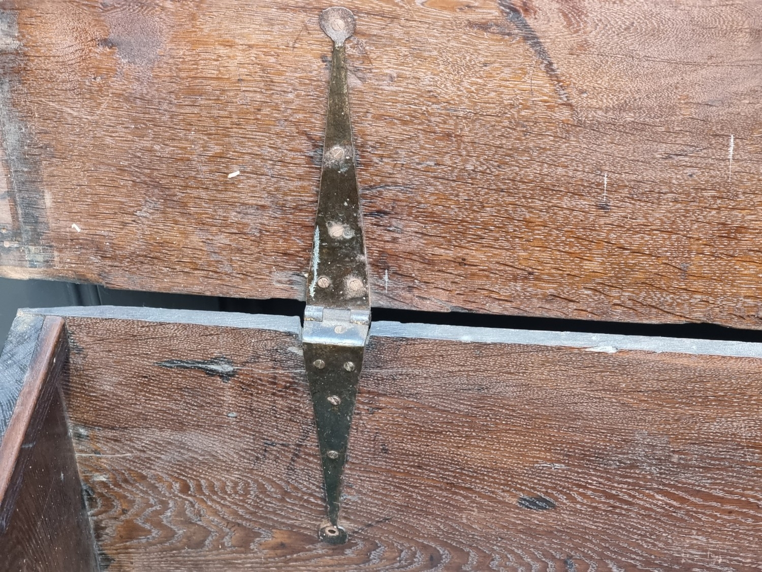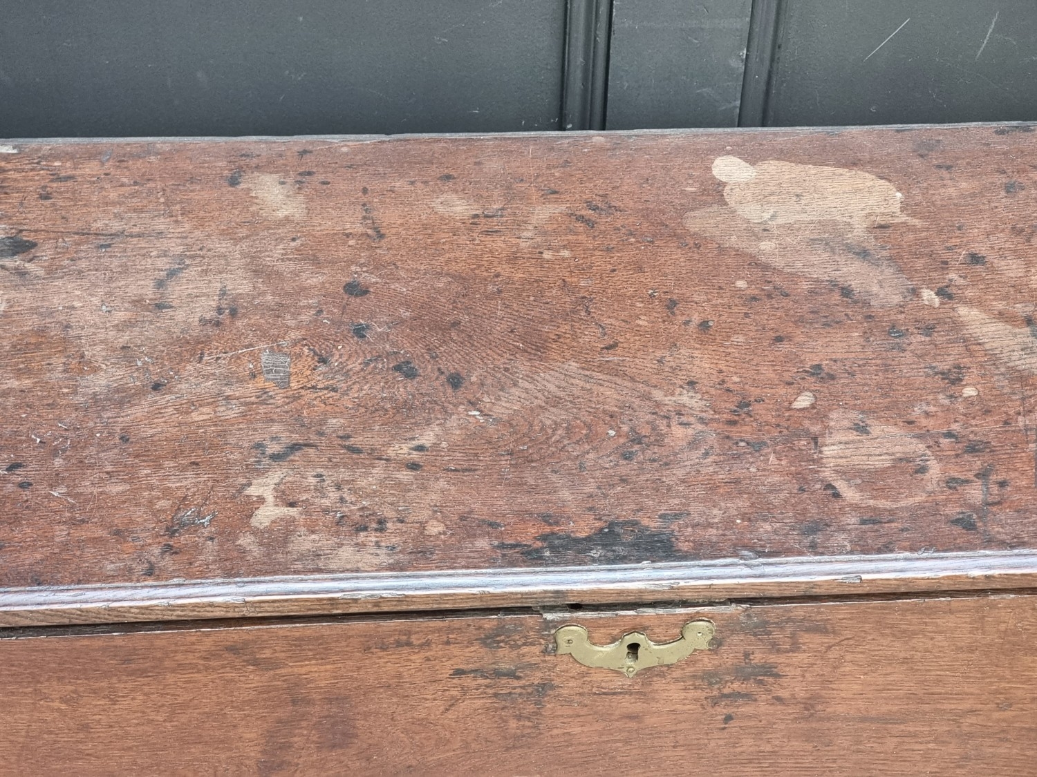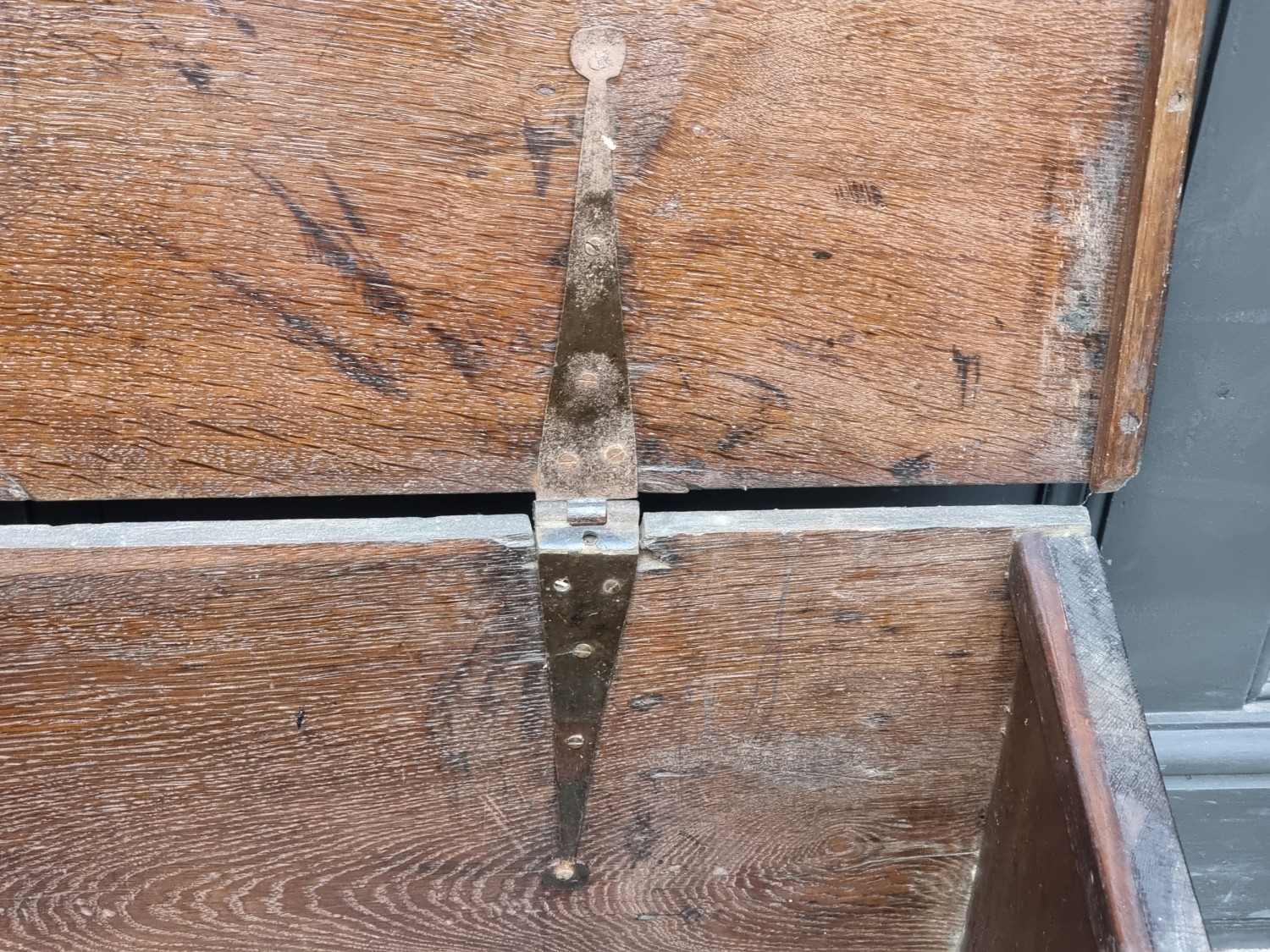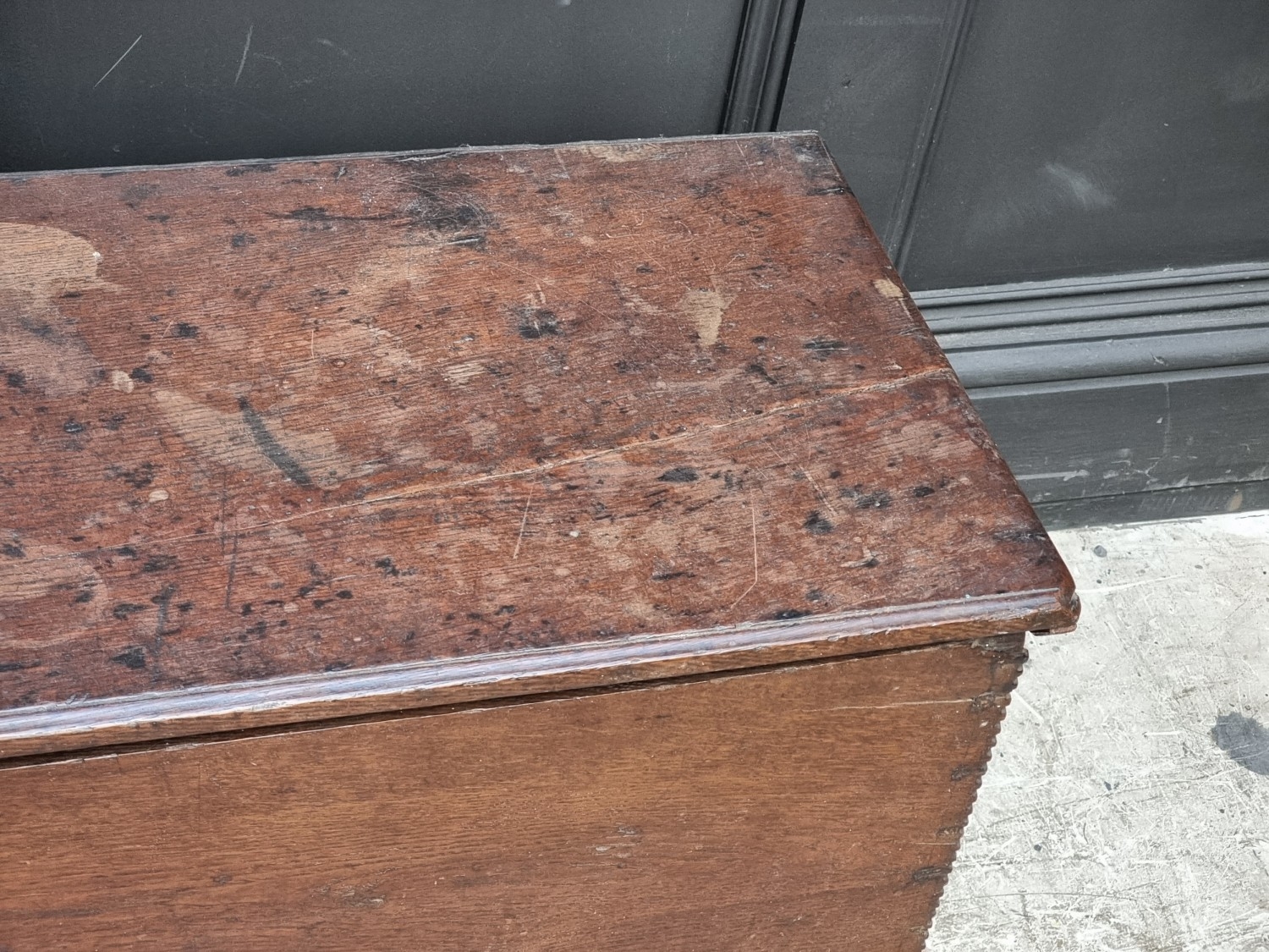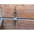 A late 17th century oak boarded coffer, 120cm wide.