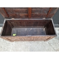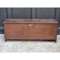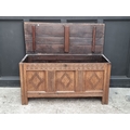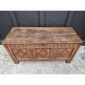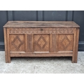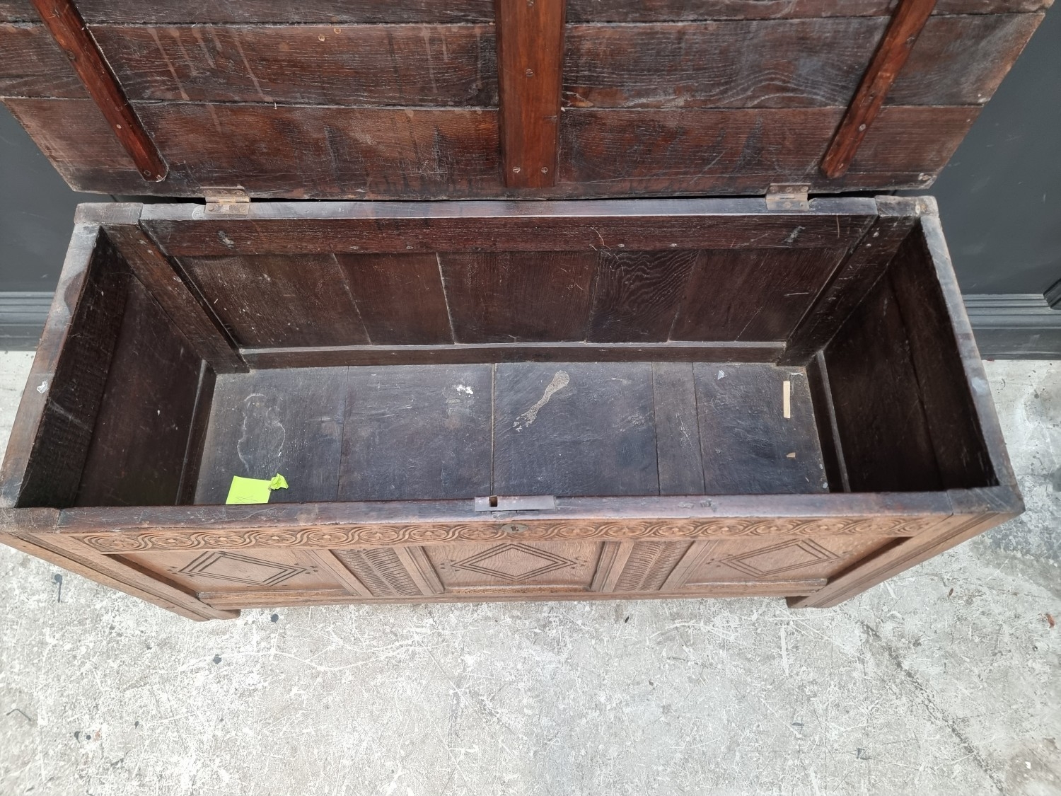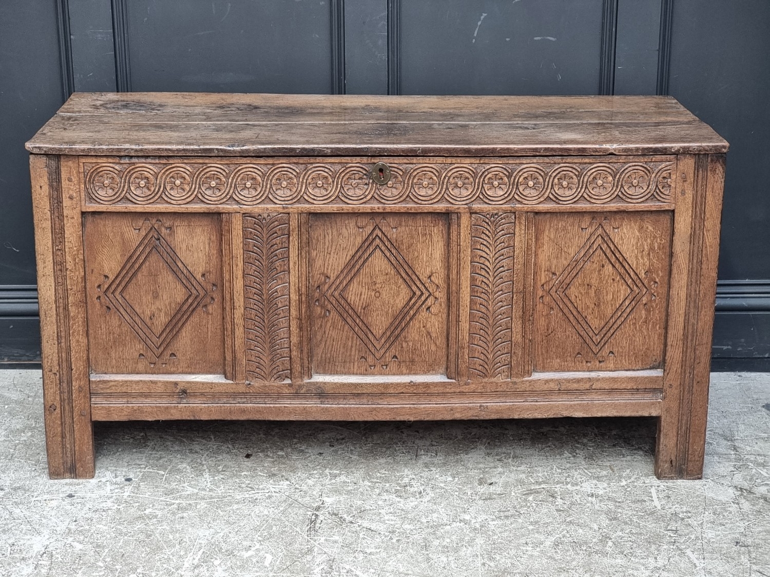 A late 17th century carved oak panelled coffer, 130.5cm wide.