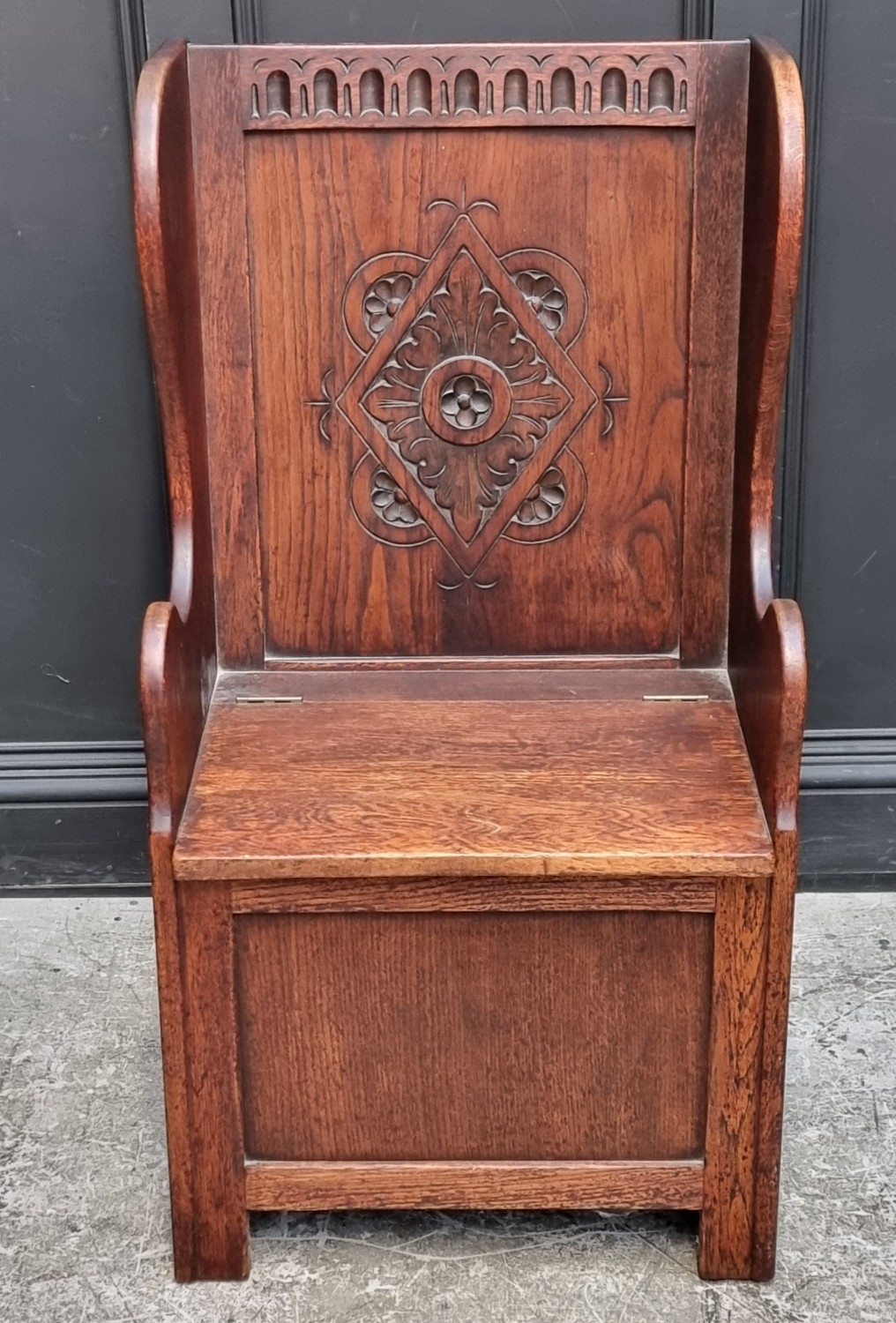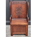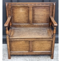 A small carved oak box seat settle, 56cm wide.