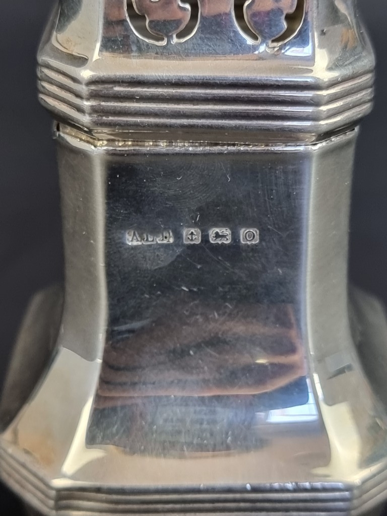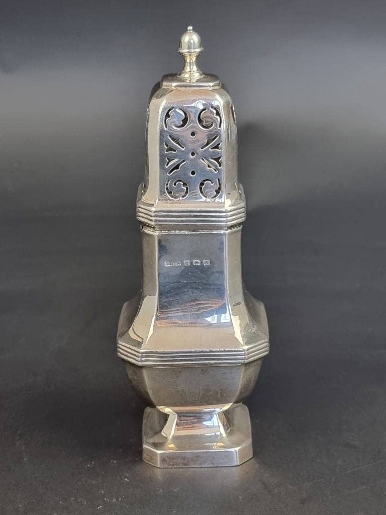 A silver sugar caster, by A L Davenport Ltd, Birmingham 1938, 18cm, 161g.