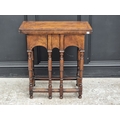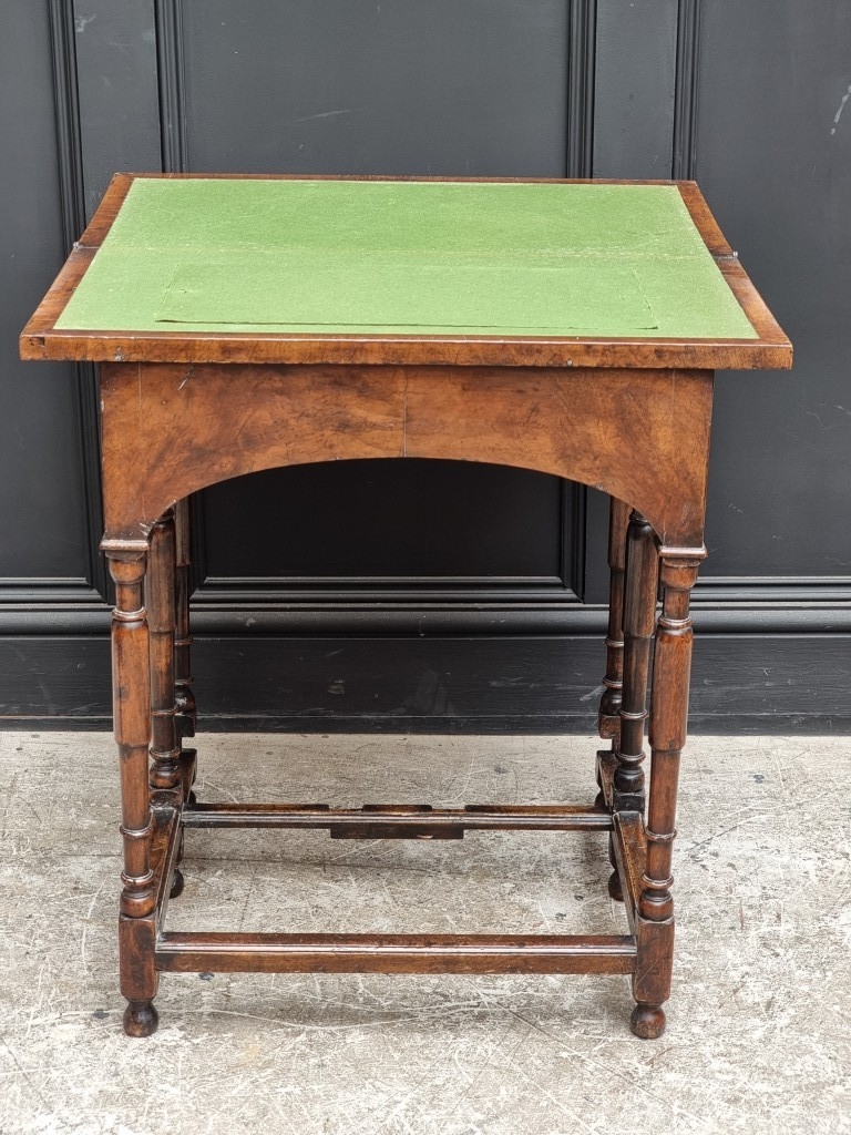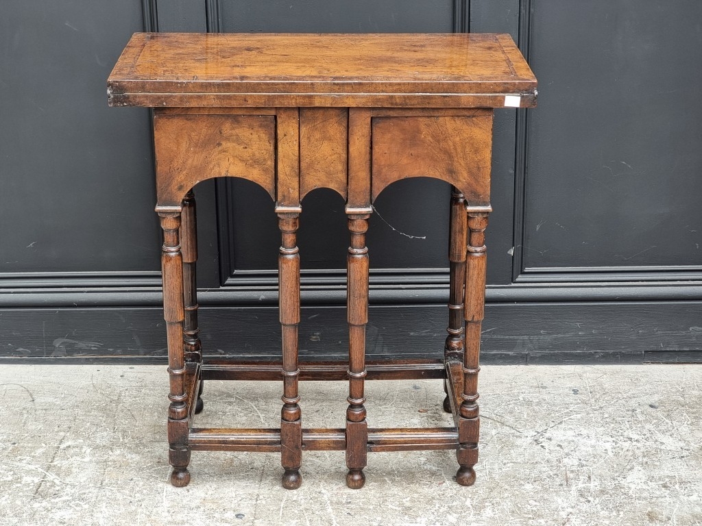 An unusual 18th century walnut, feather and crossbanded card table, with fold-over top and double gateleg, 67cm wide.