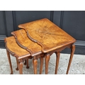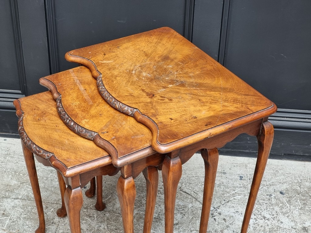 A nest of three 1930s walnut tables, largest 54cm wide.