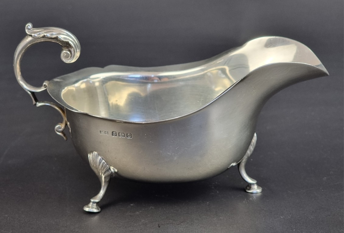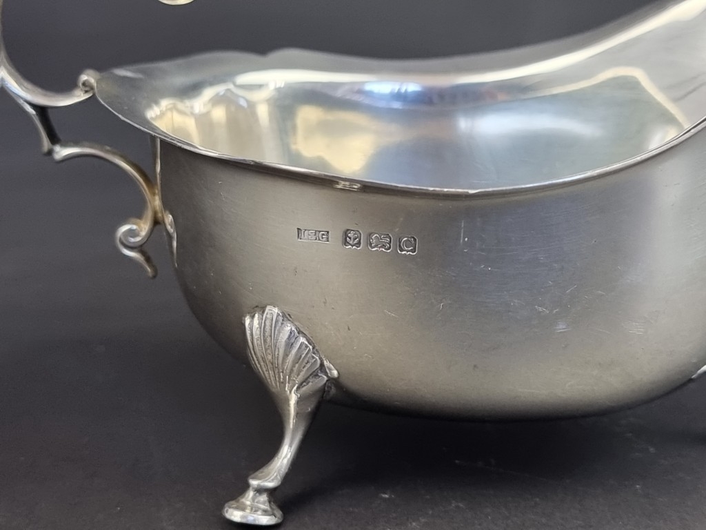 A silver sauce boat, by I S Greenberg & Co, Birmingham 1927, height to handle 9cm, 196g.