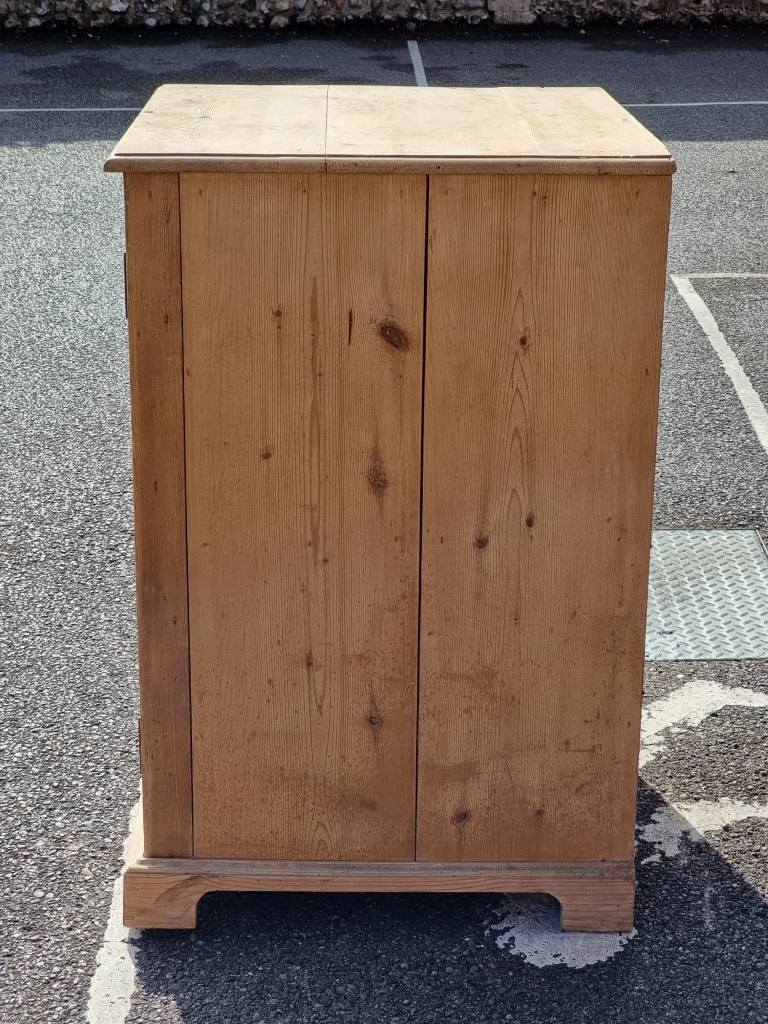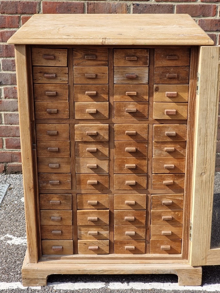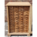 An interesting pine multi-drawer cabinet, the glazed panel door enclosing forty eight small drawers, 94cm high x 68.5cm wide x 62.5cm deep.