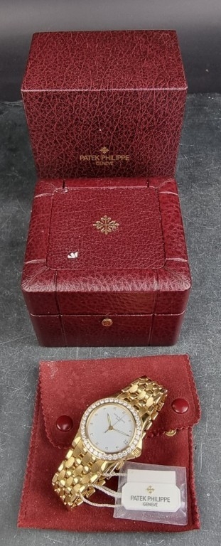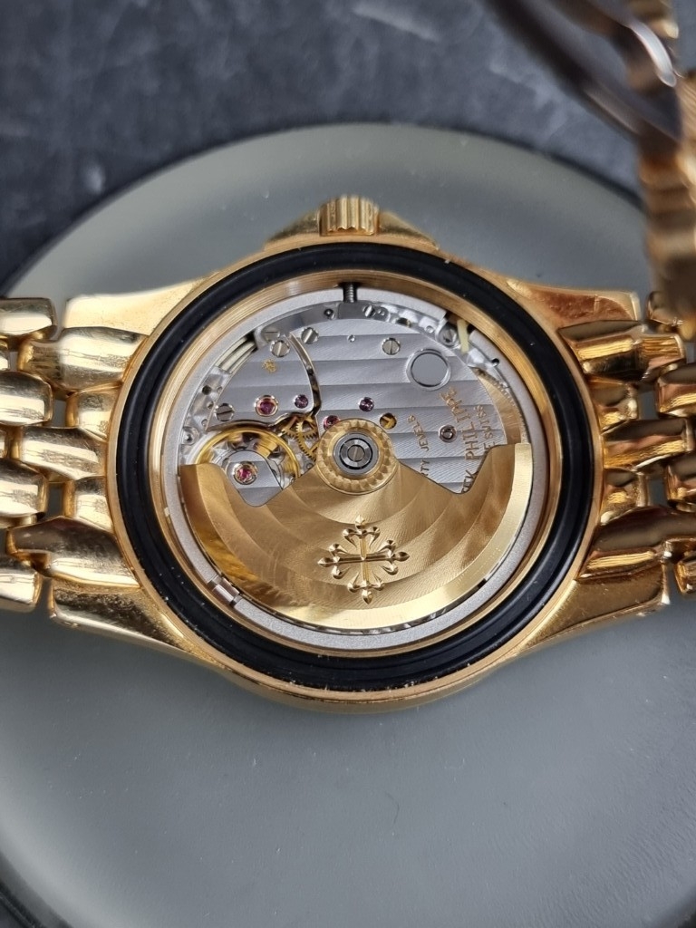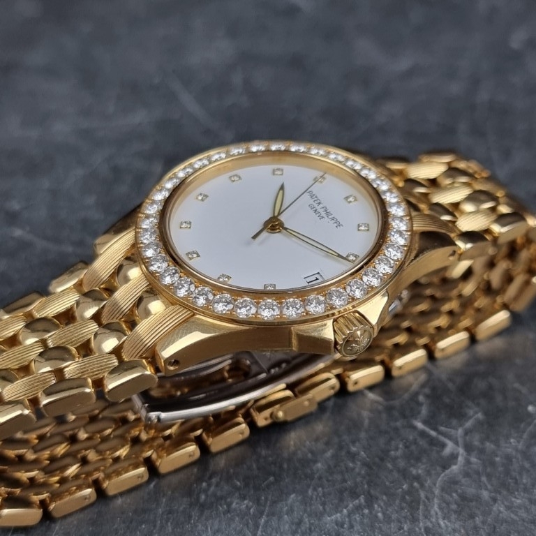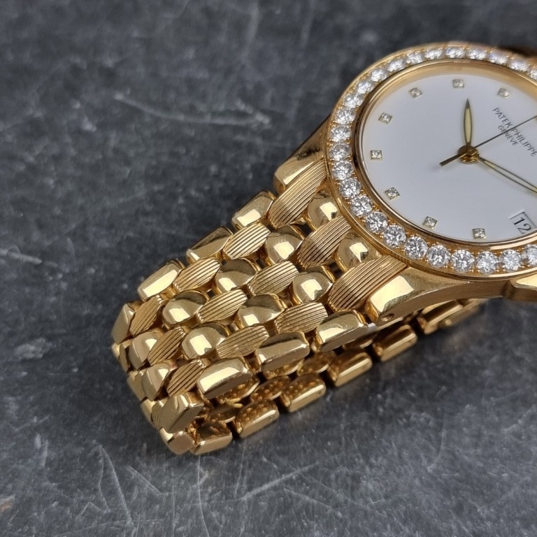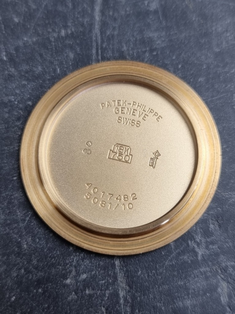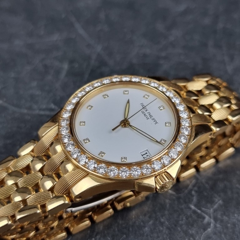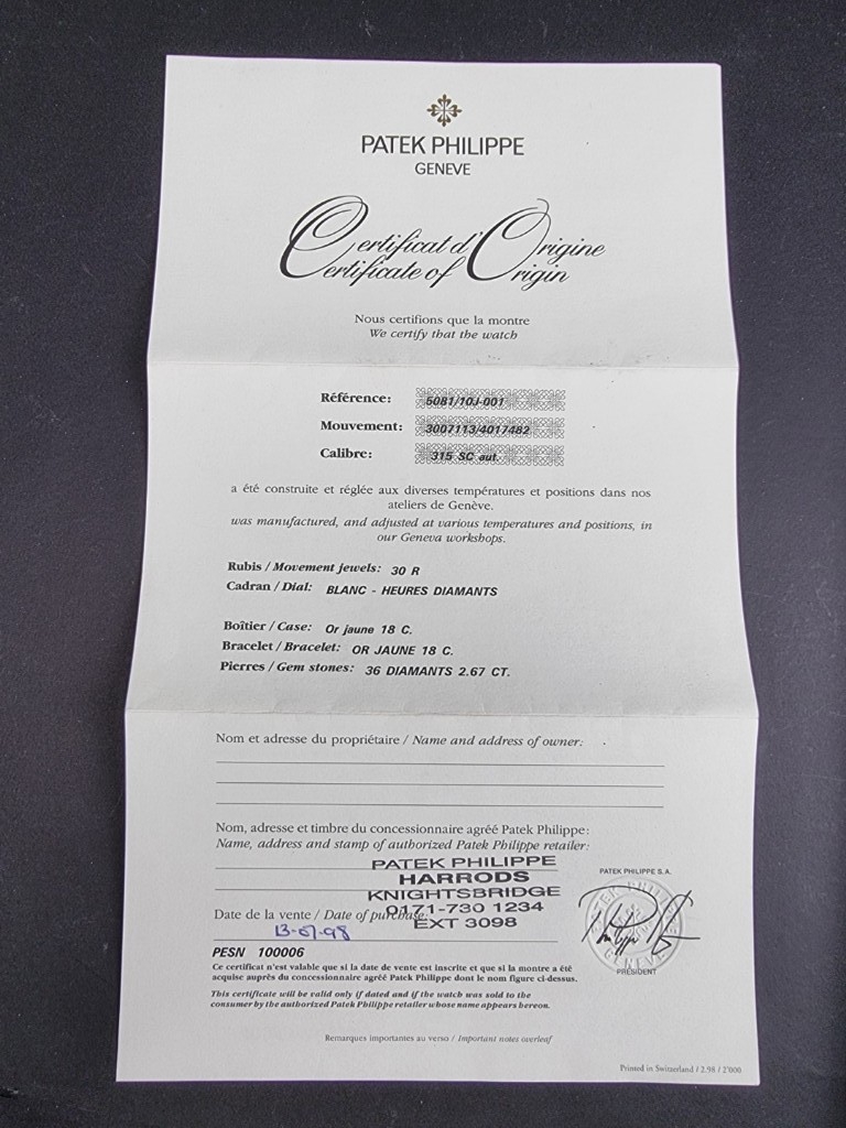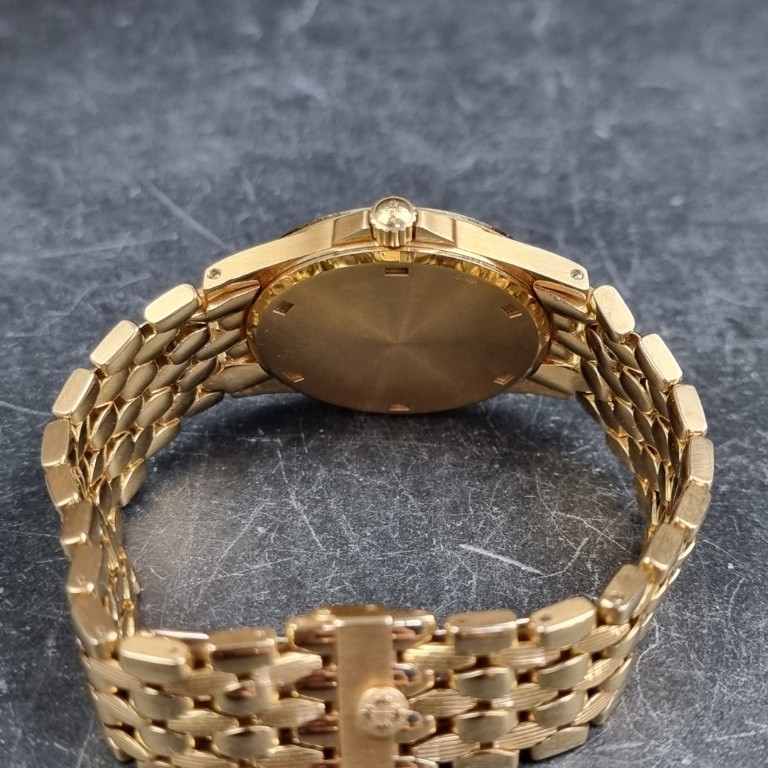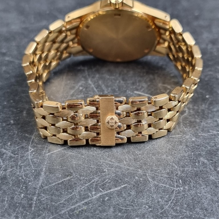 A late 1990s Patek Philippe 'Neptune' 18ct gold automatic wristwatch, 36mm, having diamond set bezel and indices, the thirty-six diamonds totalling 2.67ct, Ref. 5081/10J-001, Cal. 315 SC, on original 18ct gold 'Nautilus' bracelet, with box and papers.