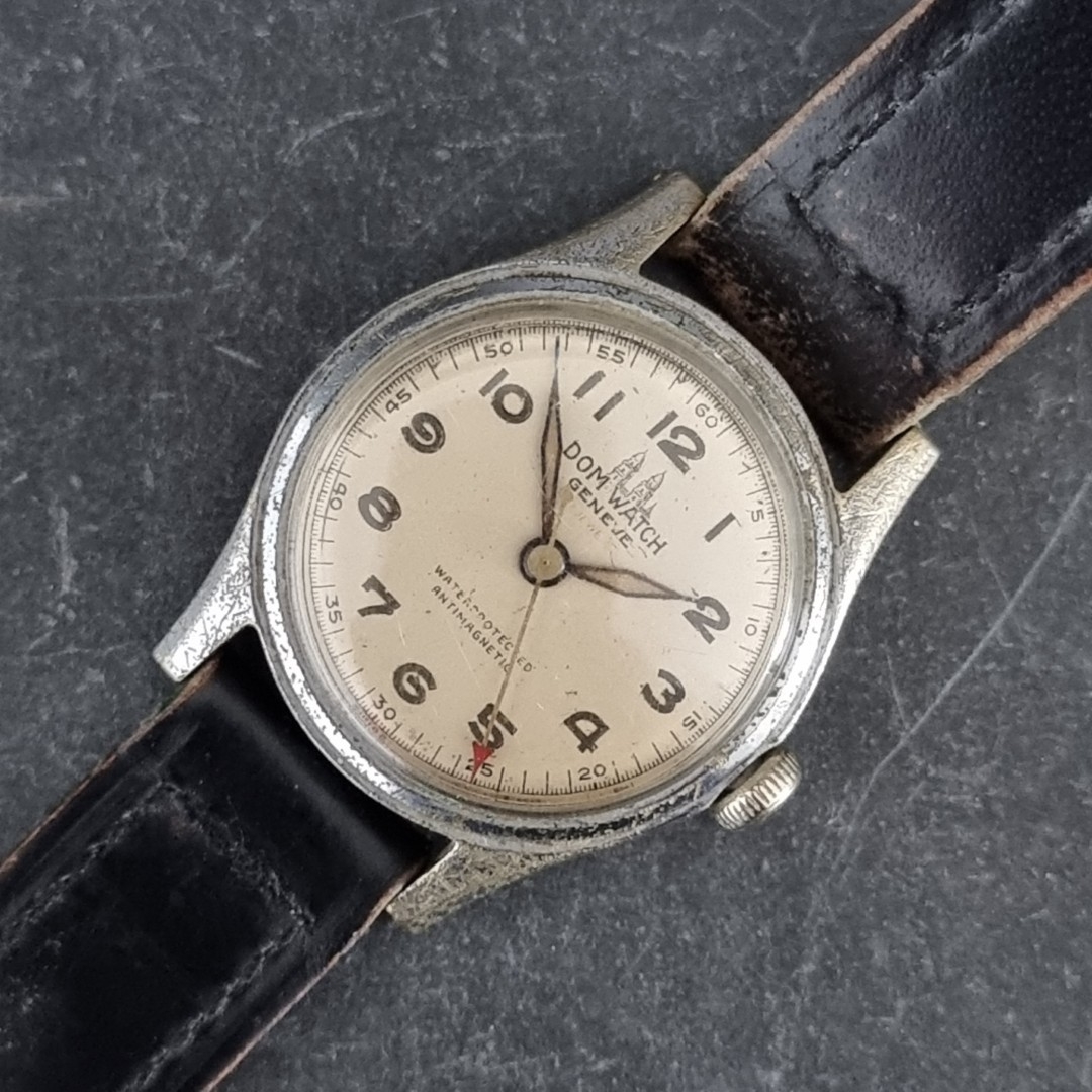 A circa 1950 Dom plated brass manual wind wristwatch, 31.5mm, Ref. 10513, on contemporary black leather strap.