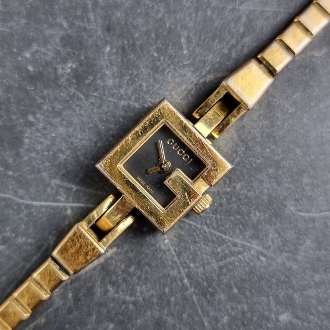 A Gucci gold plated quartz ladies wristwatch, 14mm, Ref. 102 10900122, on original bracelet.