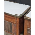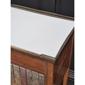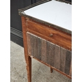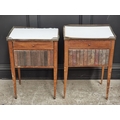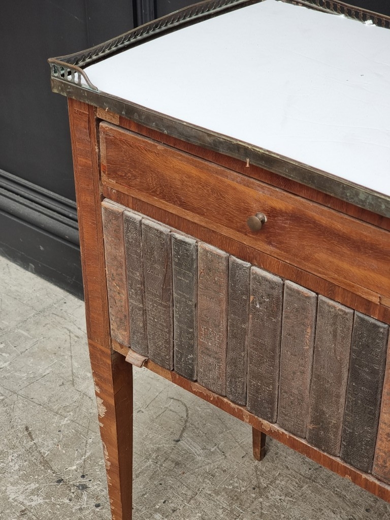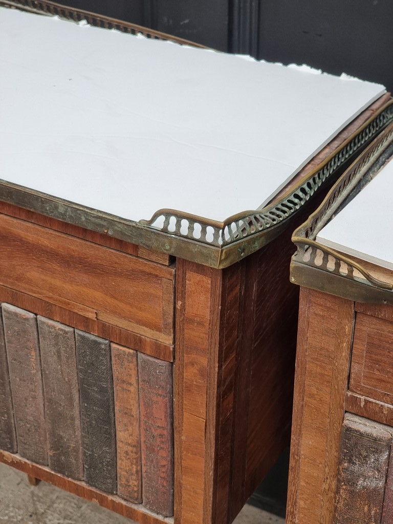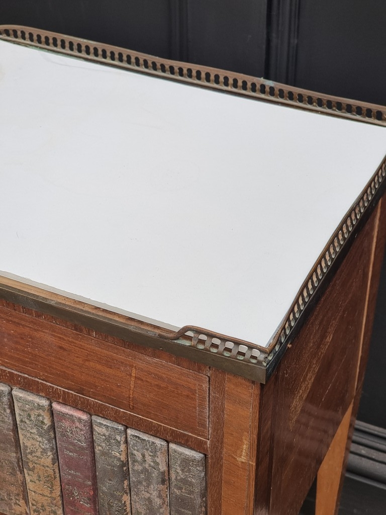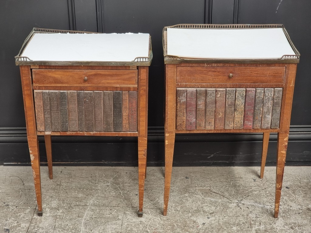 A pair of Louis XVI style mahogany bedside tables, with simulated book spine cupboard doors, 50cm wide, (as found).