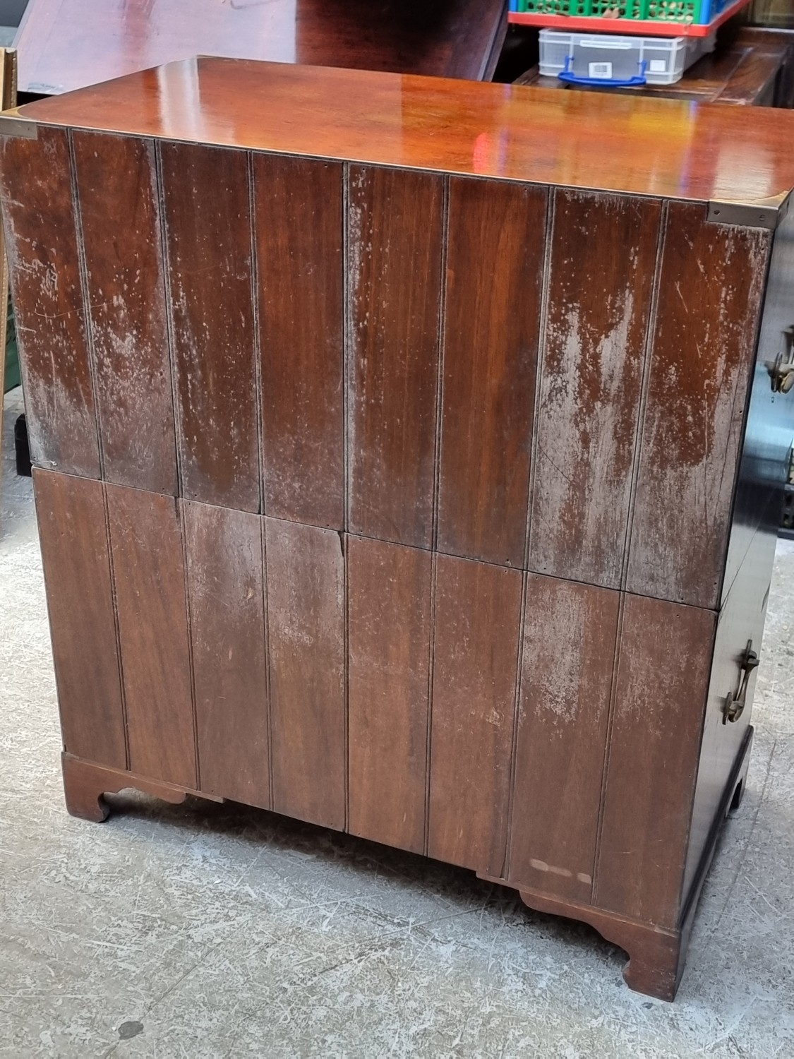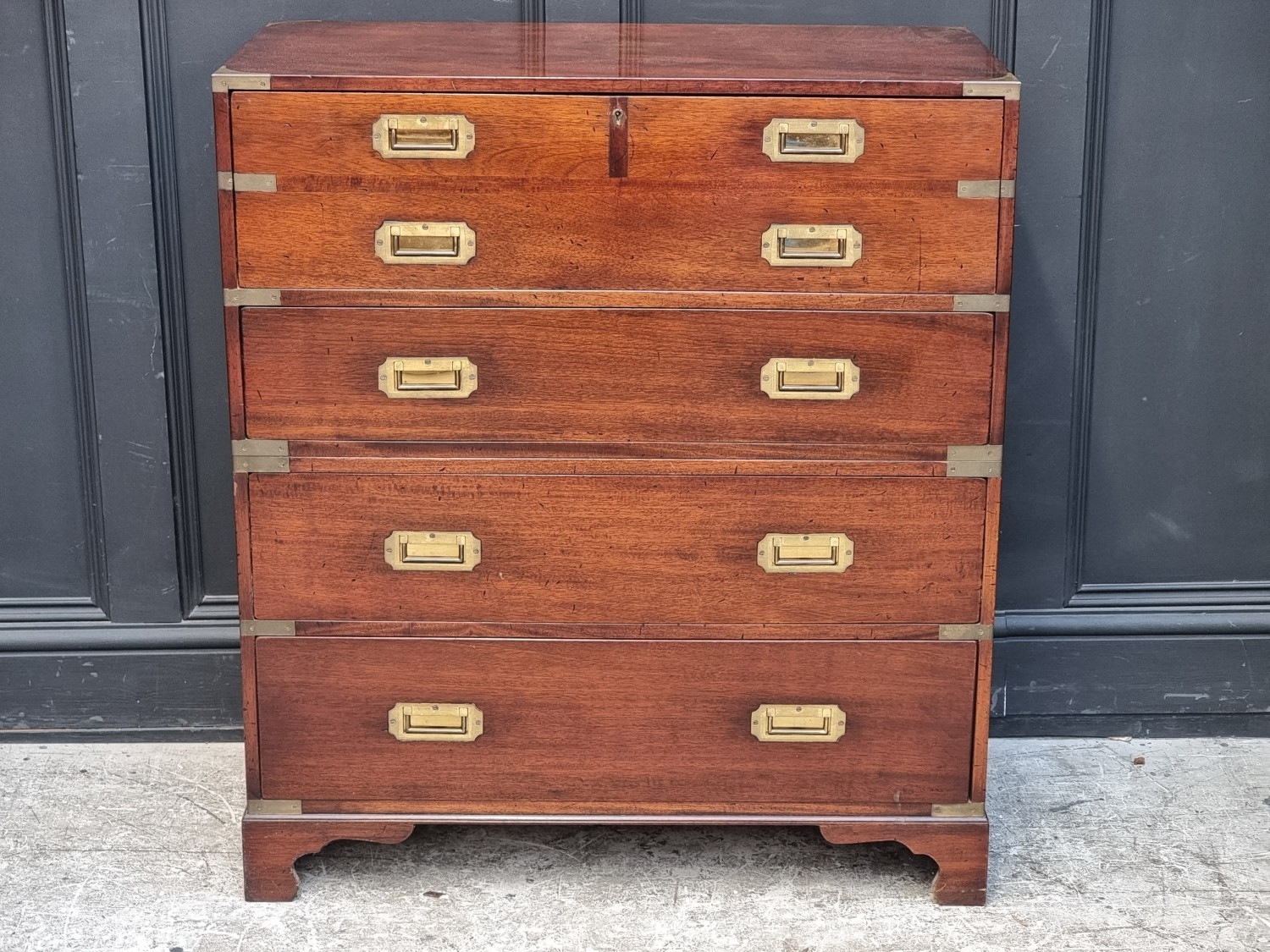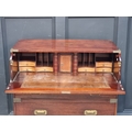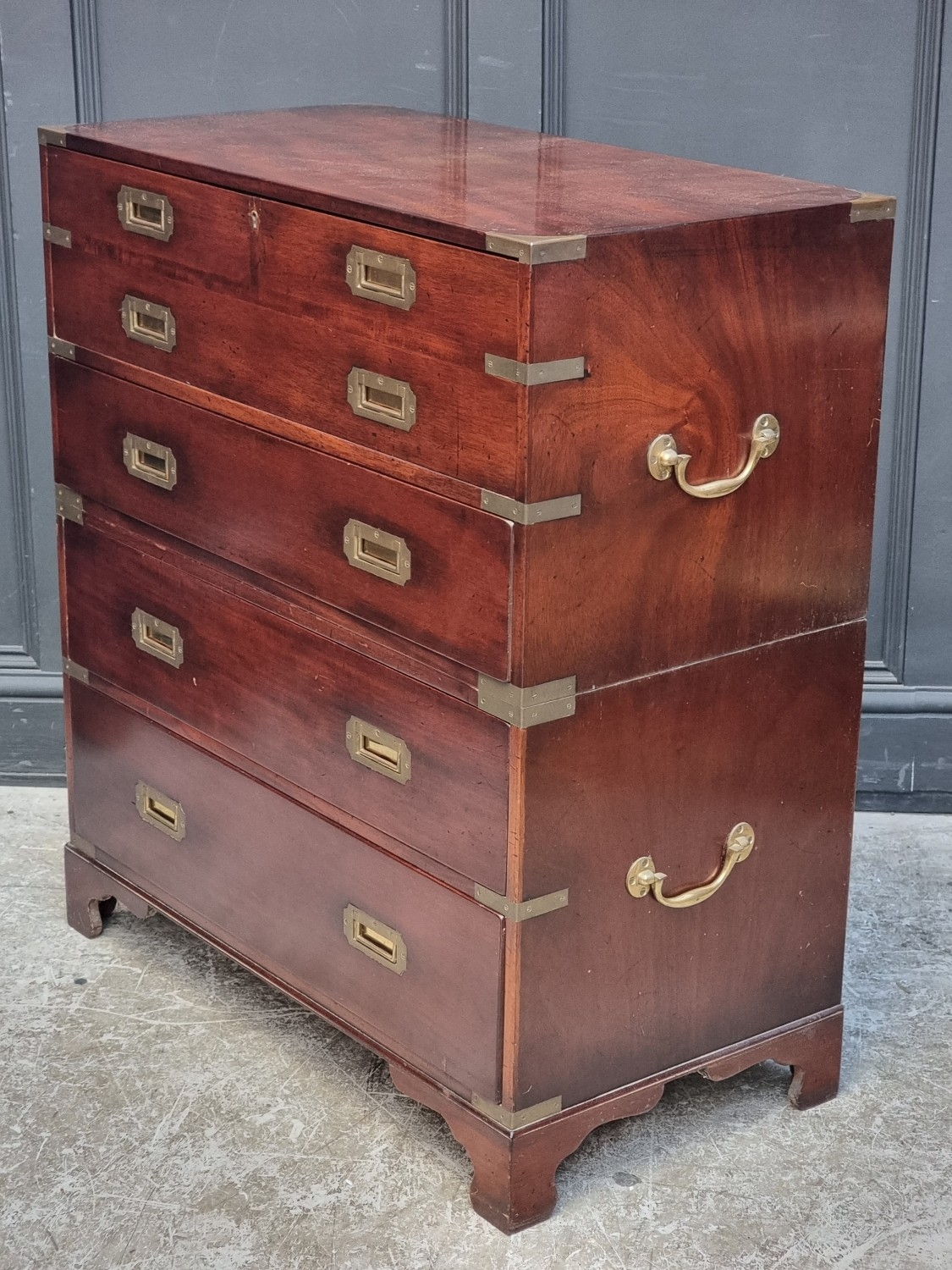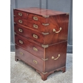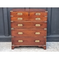 A teak and brass bound campaign chest, in two parts, with side carrying handles, 97.5cm high x 86.5cm wide x 45.5cm deep.