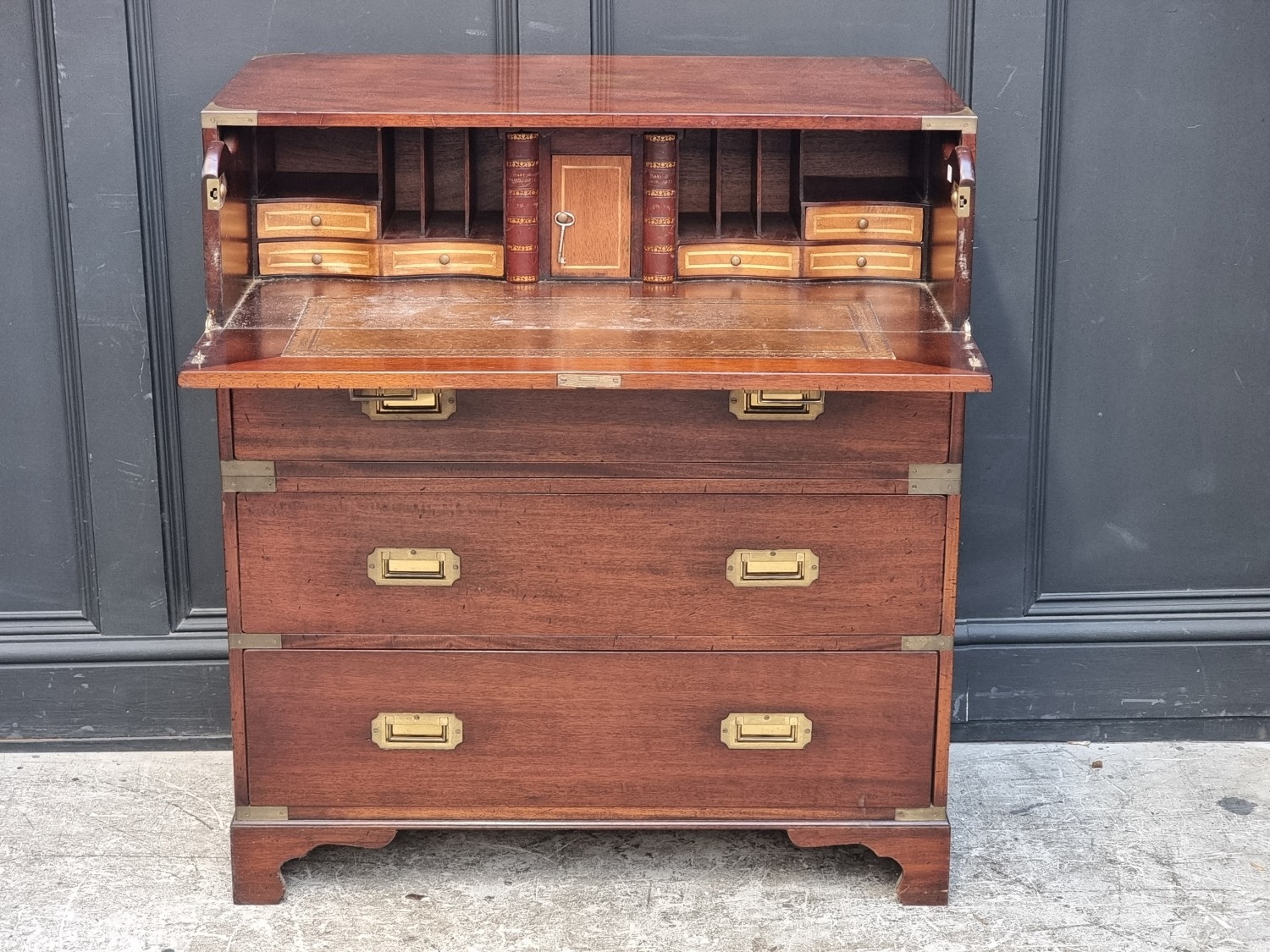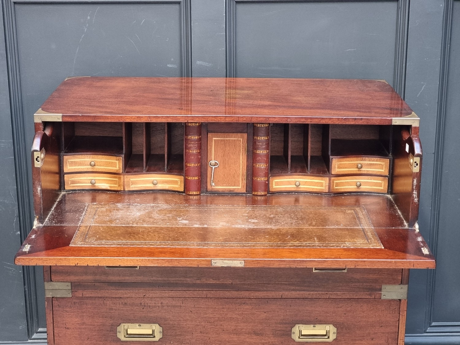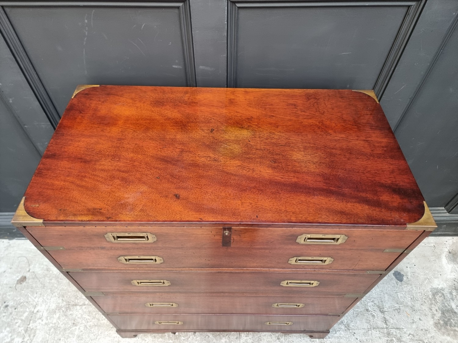 A teak and brass bound campaign chest, in two parts, with side carrying handles, 97.5cm high x 86.5cm wide x 45.5cm deep.