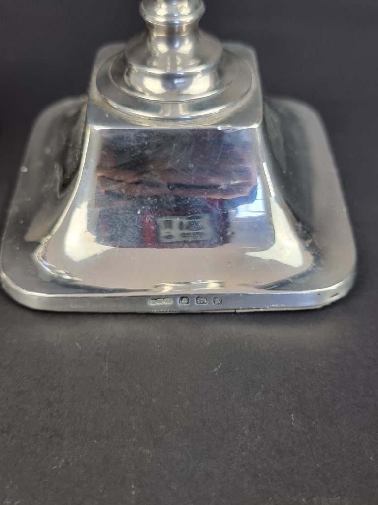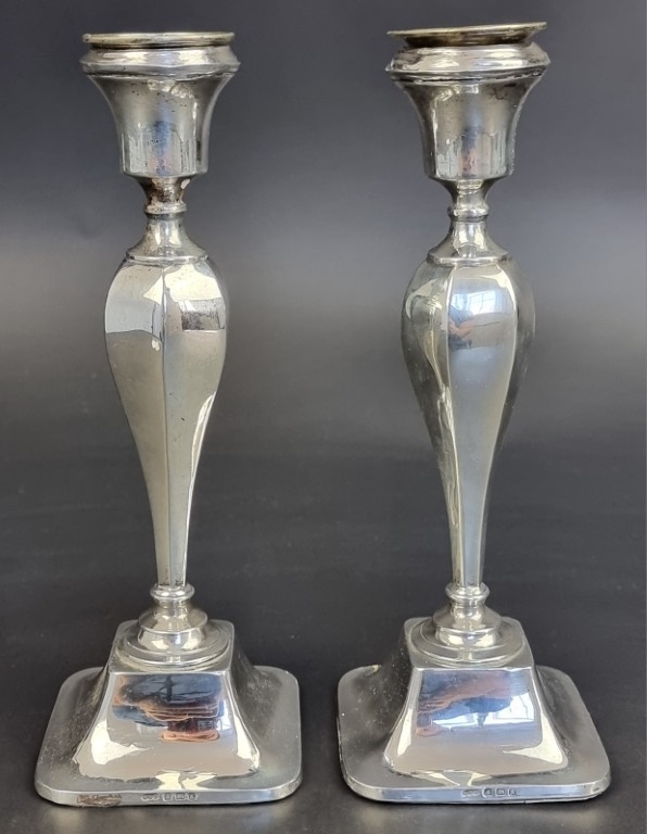 A pair of silver candlesticks, by Aaron Lufkin Dennison, Birmingham 1934, 21cm high.