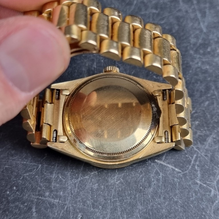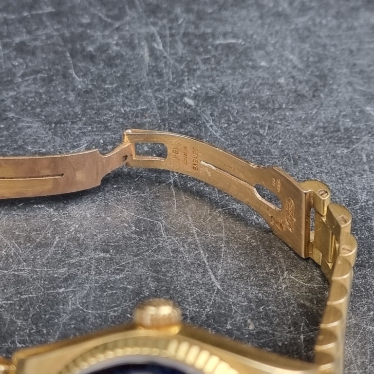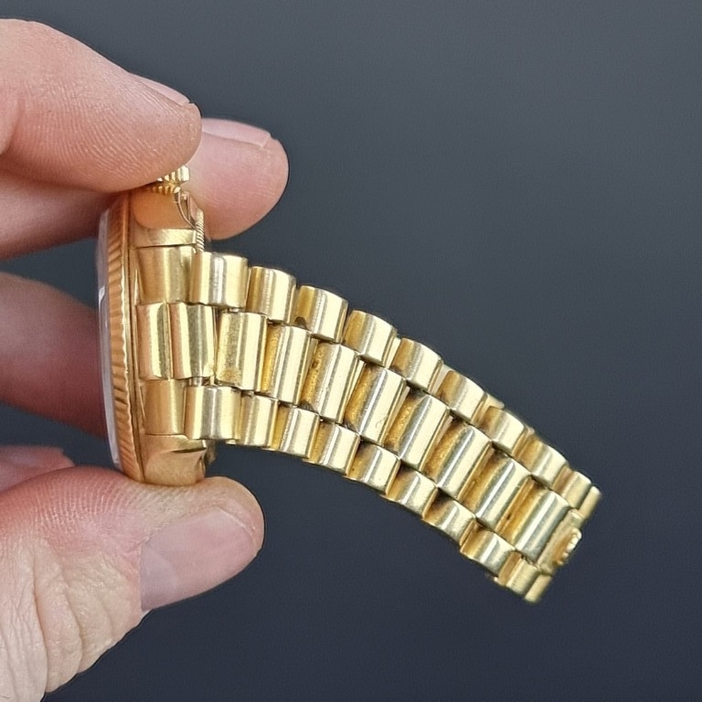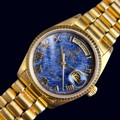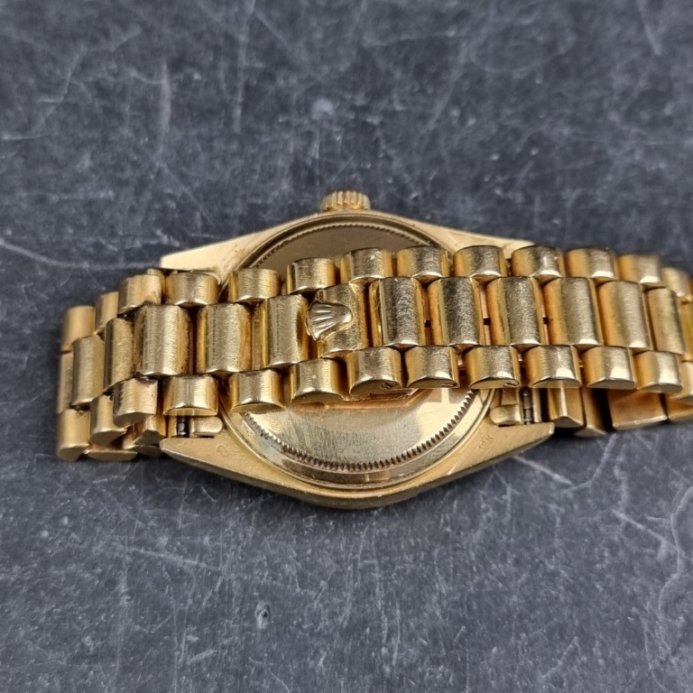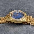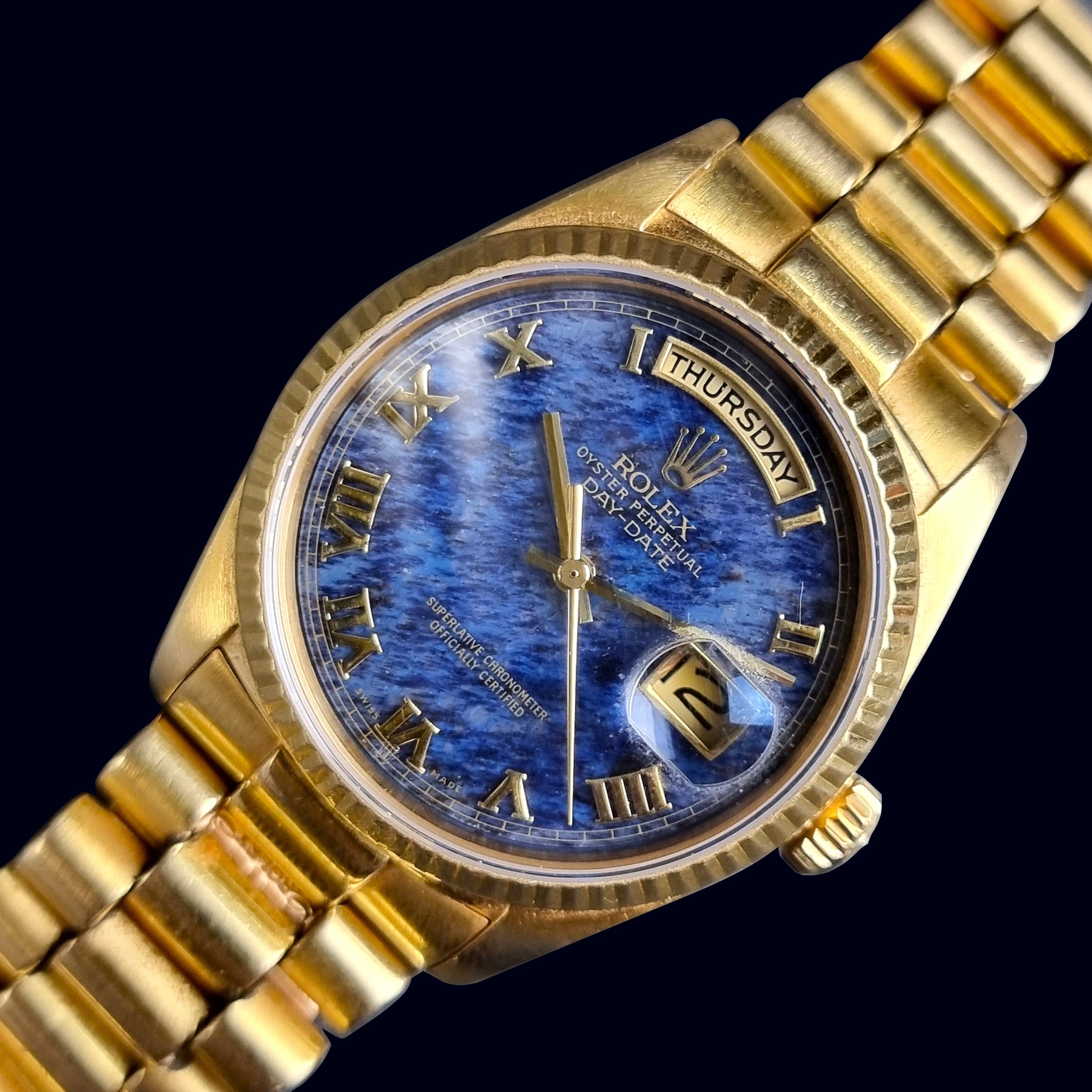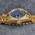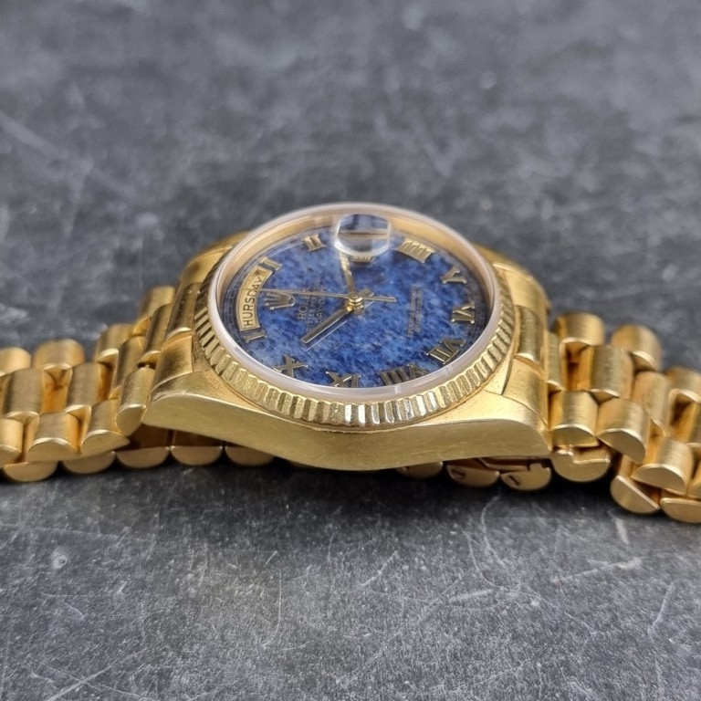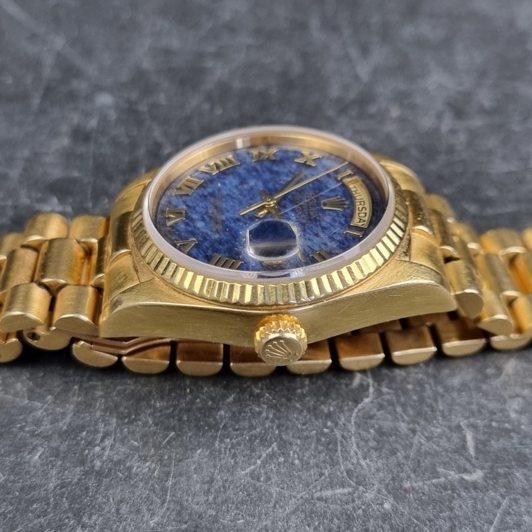 A rare 1987 Rolex 'President/Day-Date' 18ct gold automatic wristwatch, 36mm, having blue aventurine stone dial, Ref. 18038, Cal. 3055, on original 18ct gold 'President' bracelet, Ref. 8385/8 20 14-8, (full service conducted by Rolex in 2019).