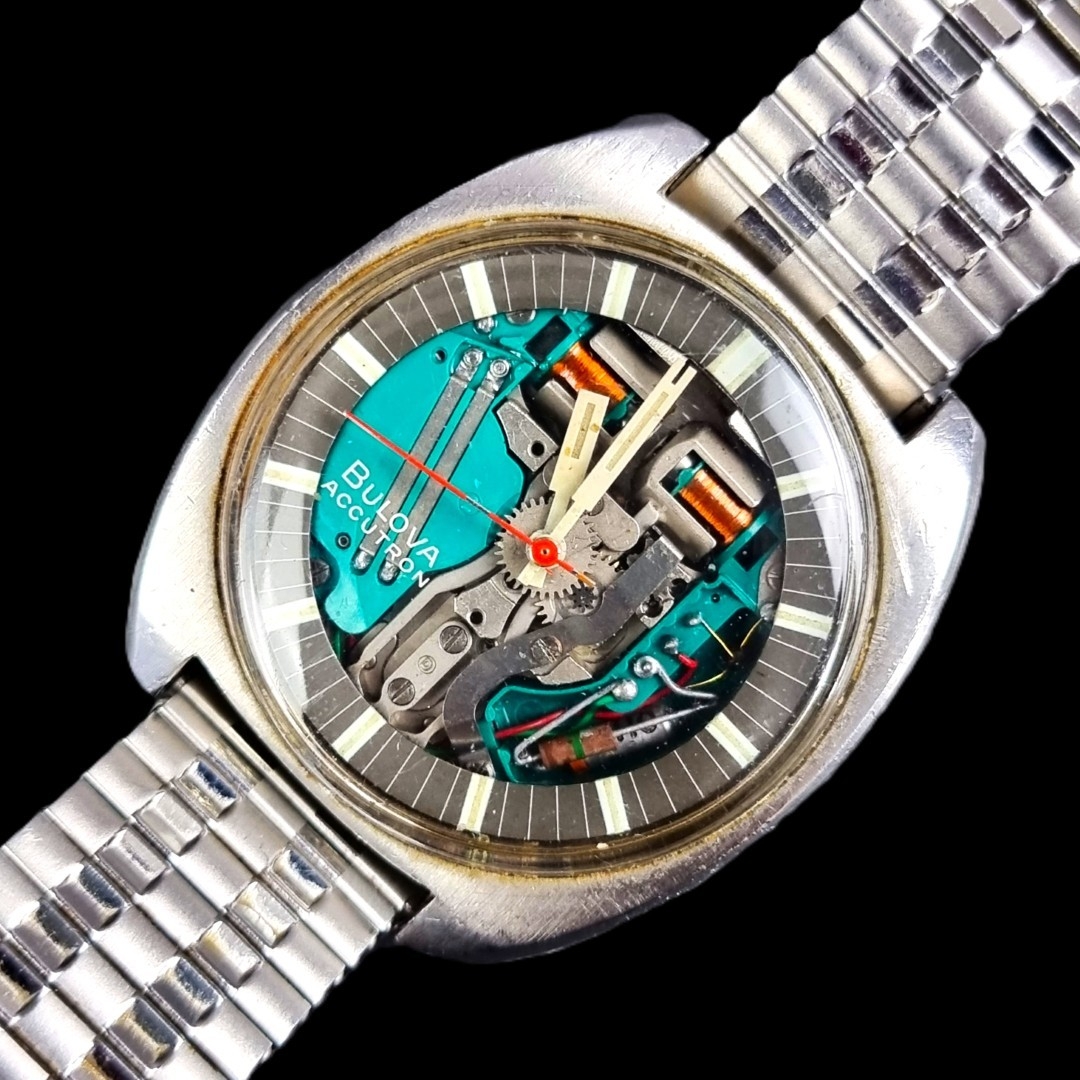 An early 1970s Bulova ‘Accutron Spaceview’ stainless steel electronic wristwatch, 38mm, Ref. 770, Cal. 214 H, on later expanding bracelet.