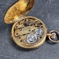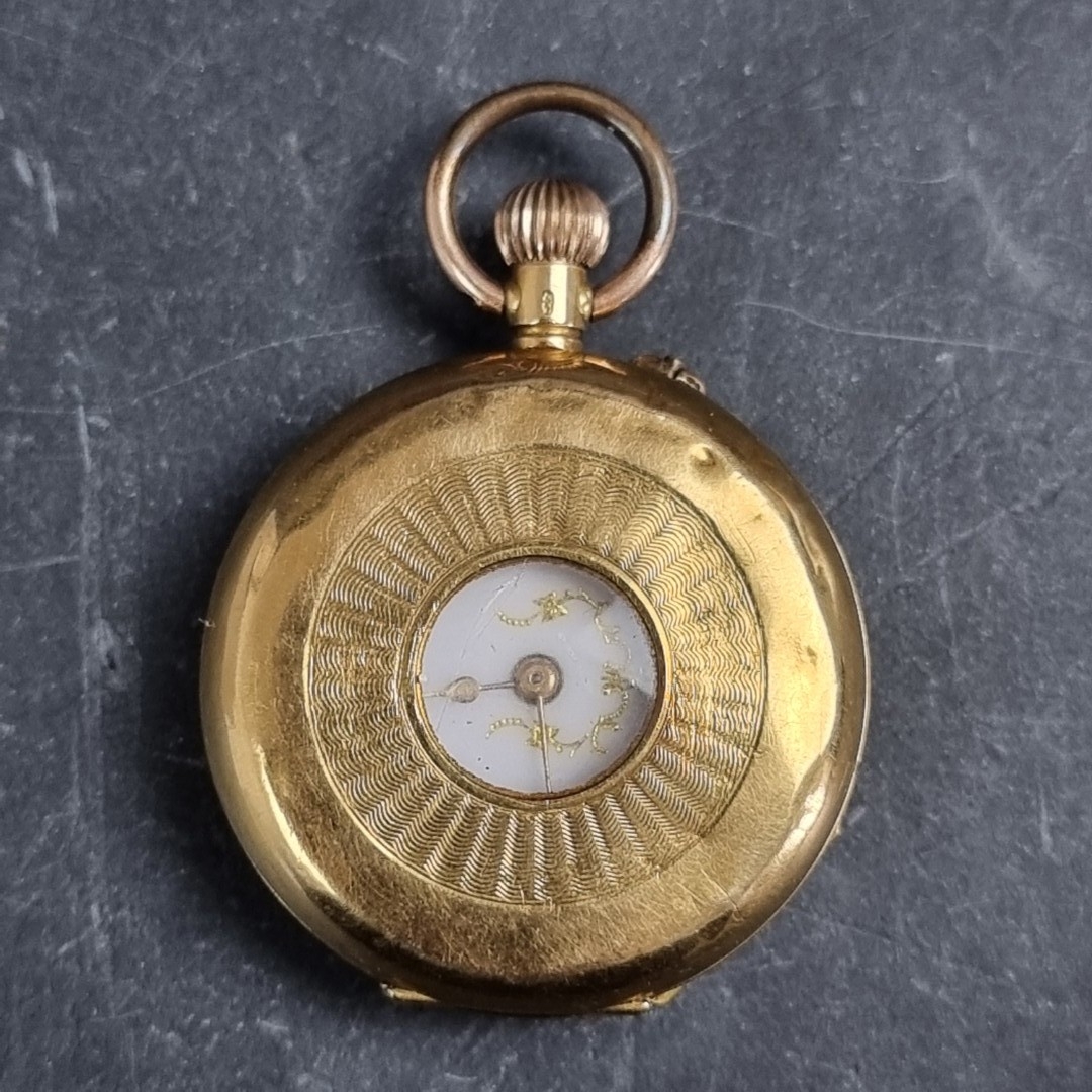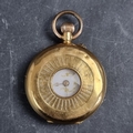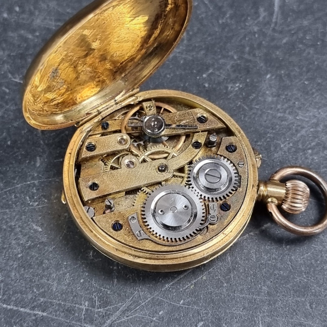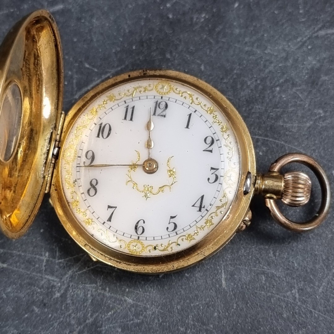 A yellow metal stem wind half-hunter pocket watch, stamped '18k', 34mm, No. 197240.