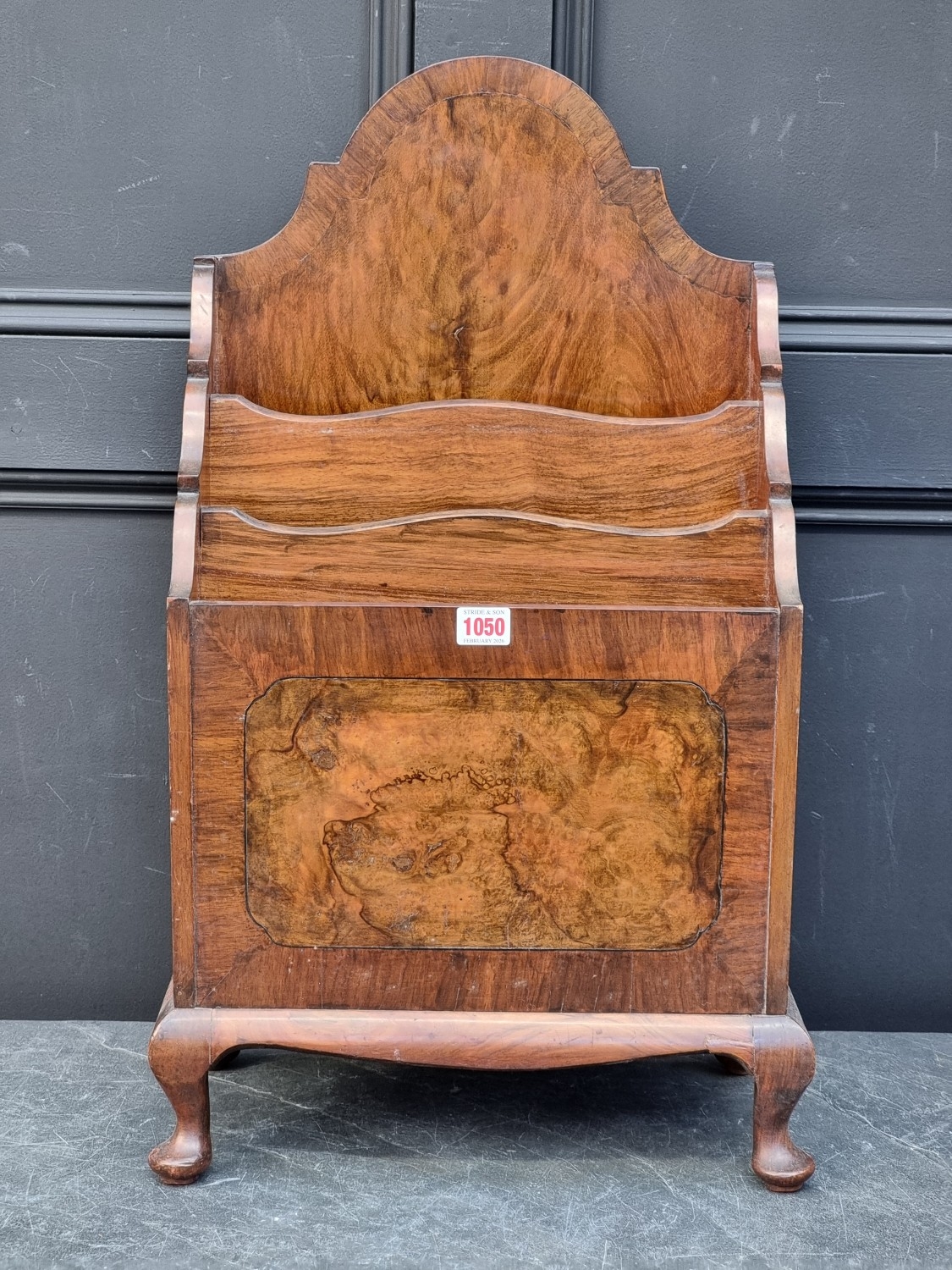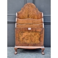 An unusual 1930s figured walnut and crossbanded Canterbury, 68.5cm high x 40.5cm wide.