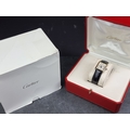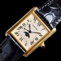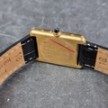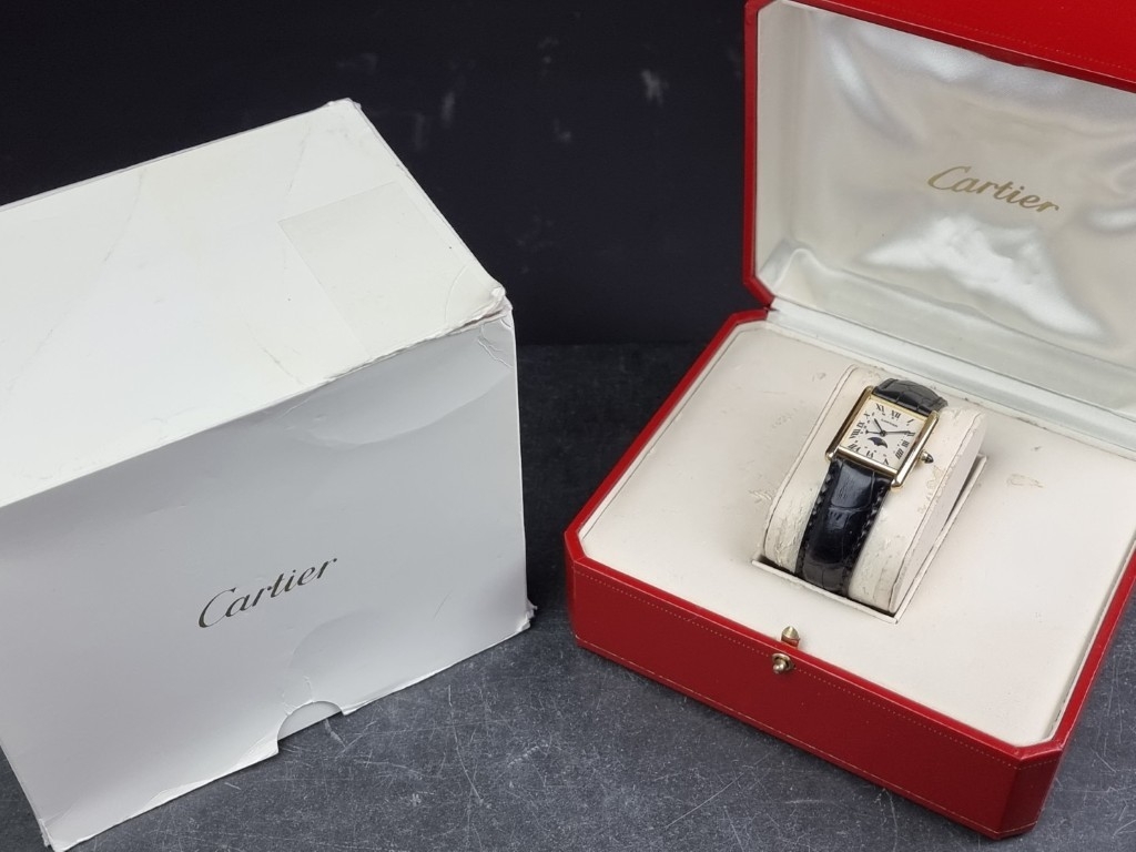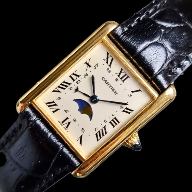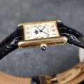 A circa 1990 Cartier 'Tank Louis Moonphase Calendar' 18ct gold quartz wristwatch, 23.5mm x 30mm, Ref. 819001, on replacement black leather strap with 18ct gold Cartier deployant clasp, boxed.