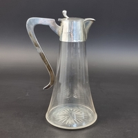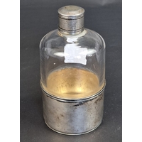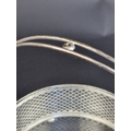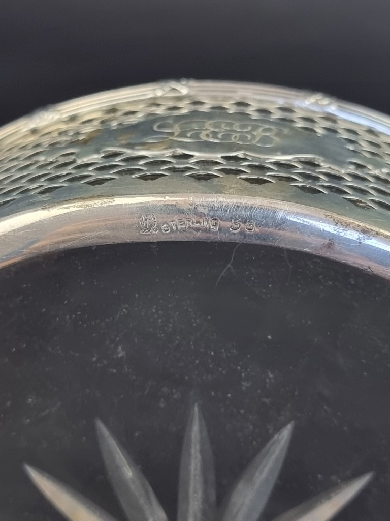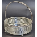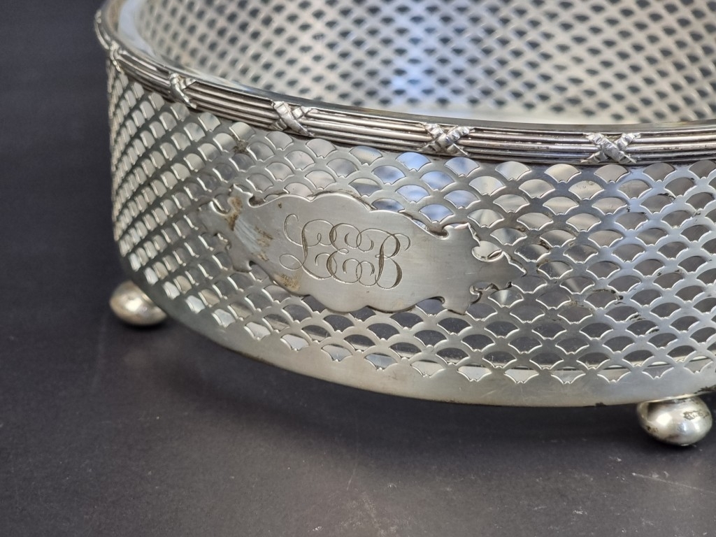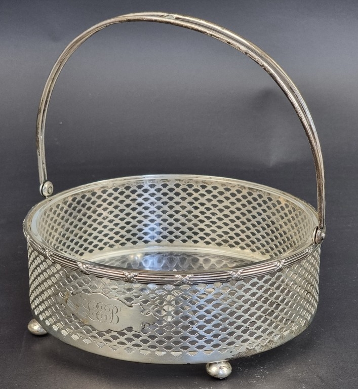 A white metal swing handled basket, with glass liner, stamped 'Sterling', 17cm diameter.