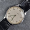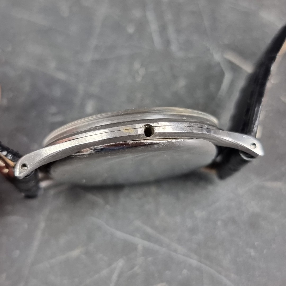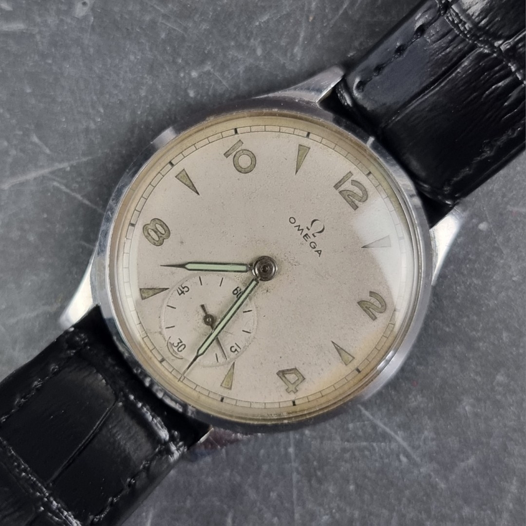A 1943 Omega stainless steel manual wind wristwatch, 34.5mm, Ref. 2403/1, on later black leather strap, (lacking crown and stem).