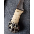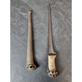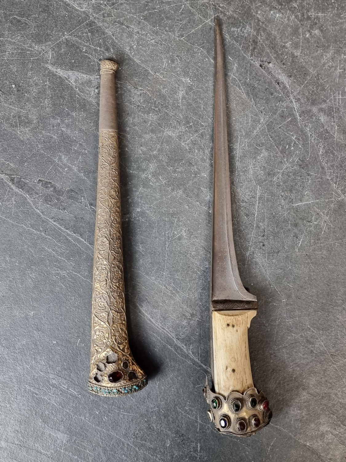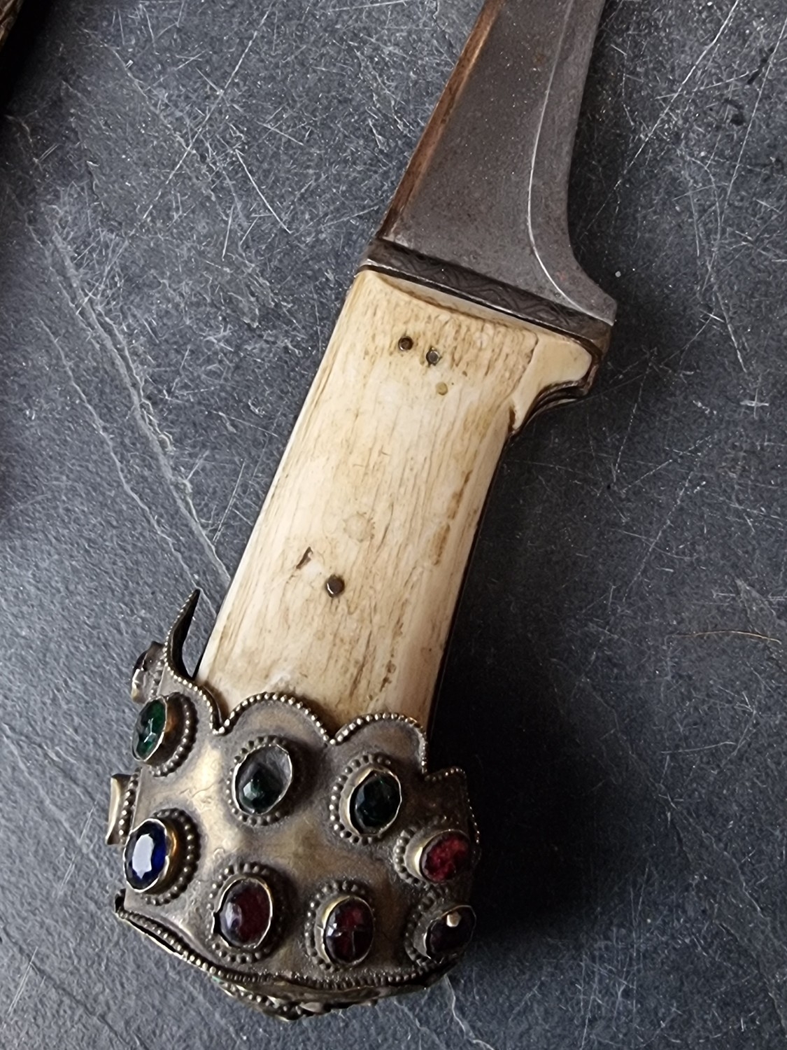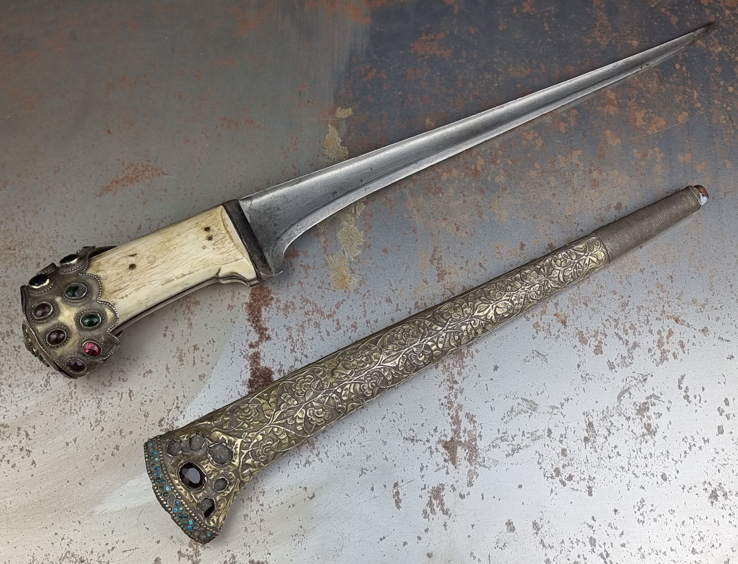 An Indo Persian peshkabze knife and sheath, with 30.5cm T section blade with bone grips, silver mounts and a bejewelled brass pommel, overall length 42.7cm.