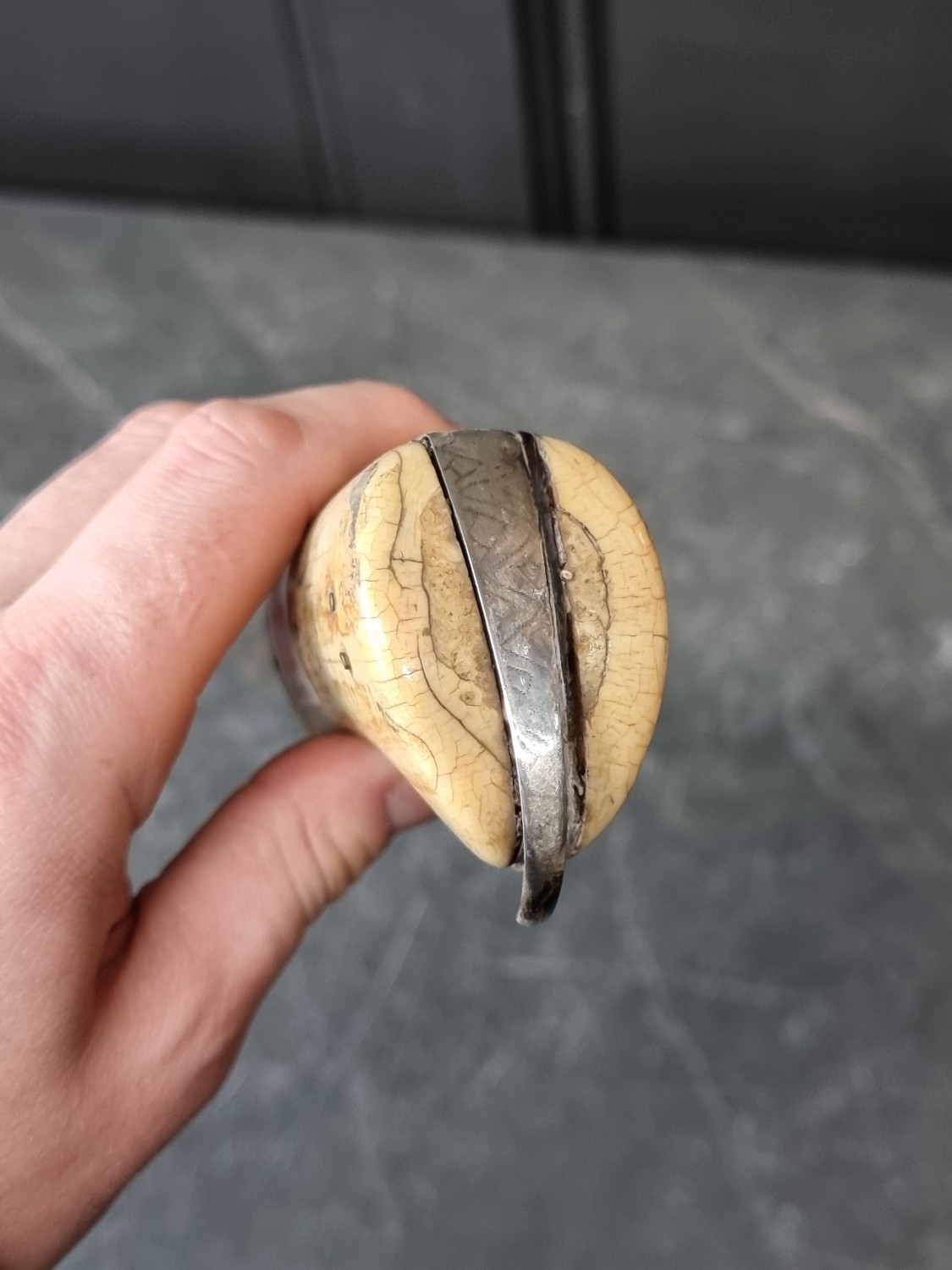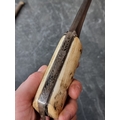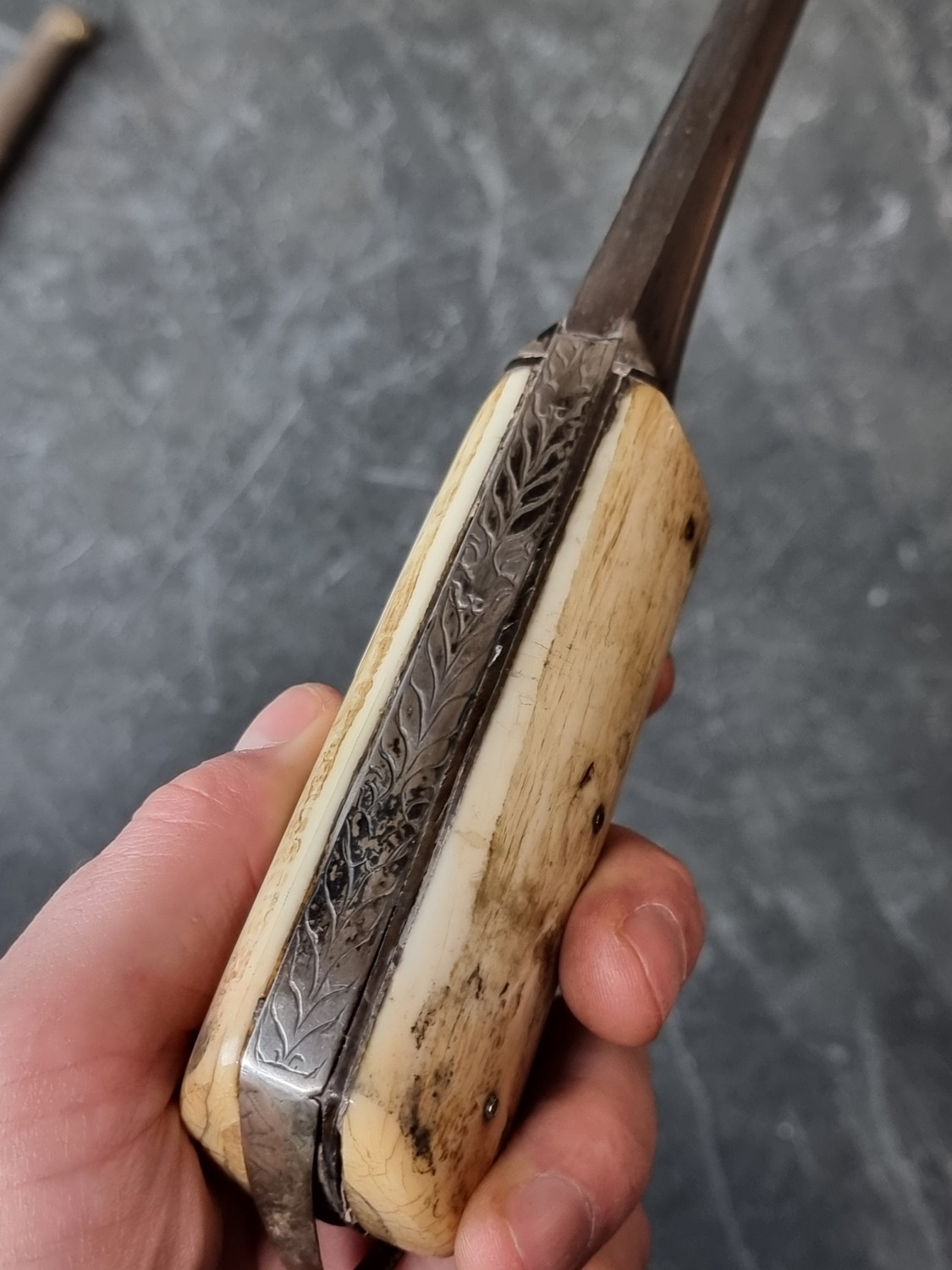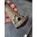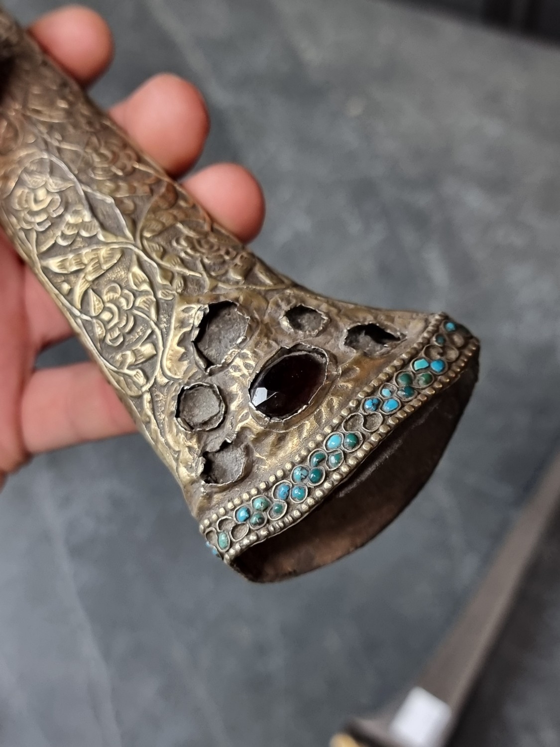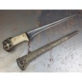 An Indo Persian peshkabze knife and sheath, with 30.5cm T section blade with bone grips, silver mounts and a bejewelled brass pommel, overall length 42.7cm.