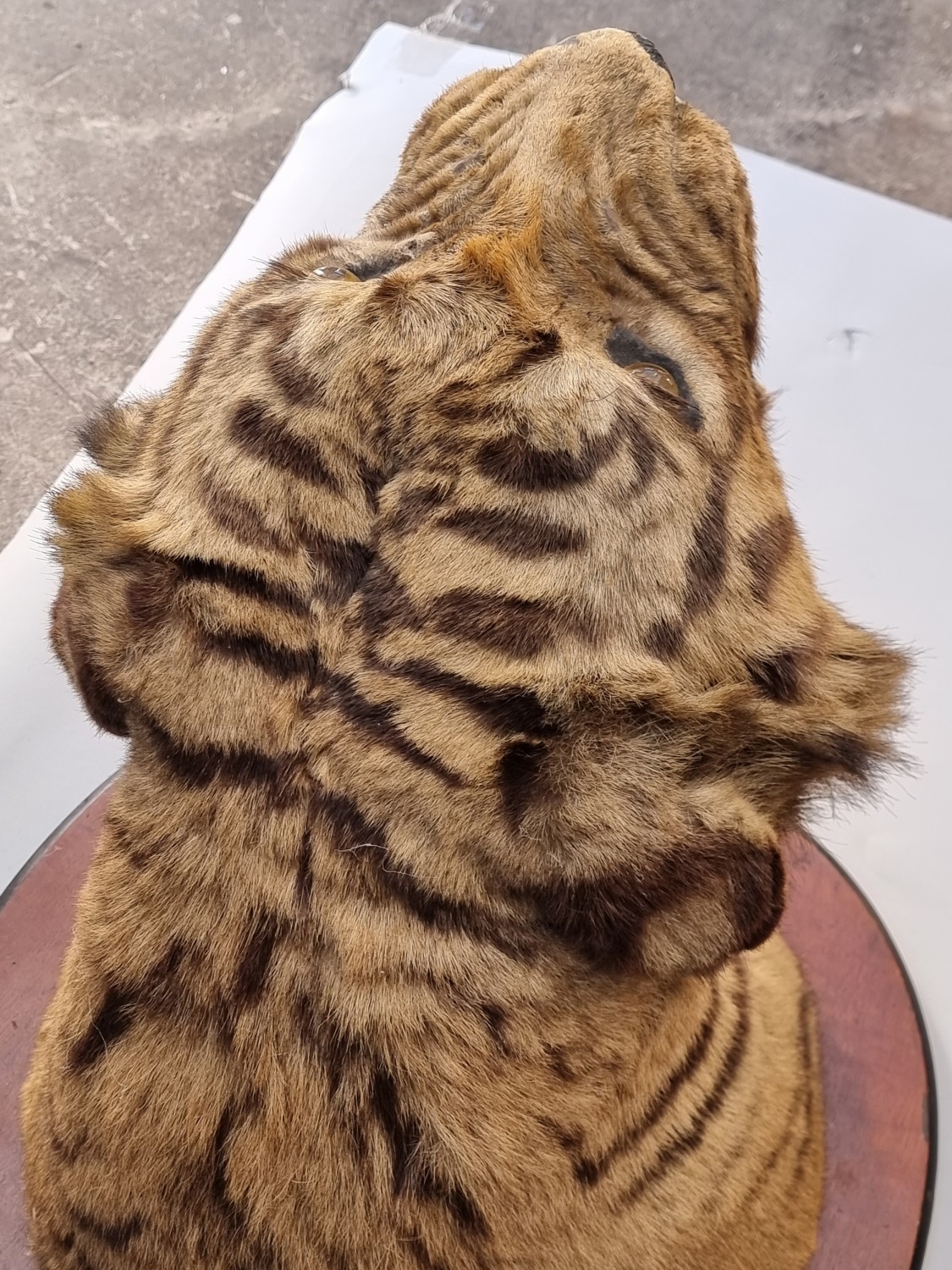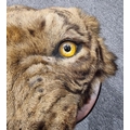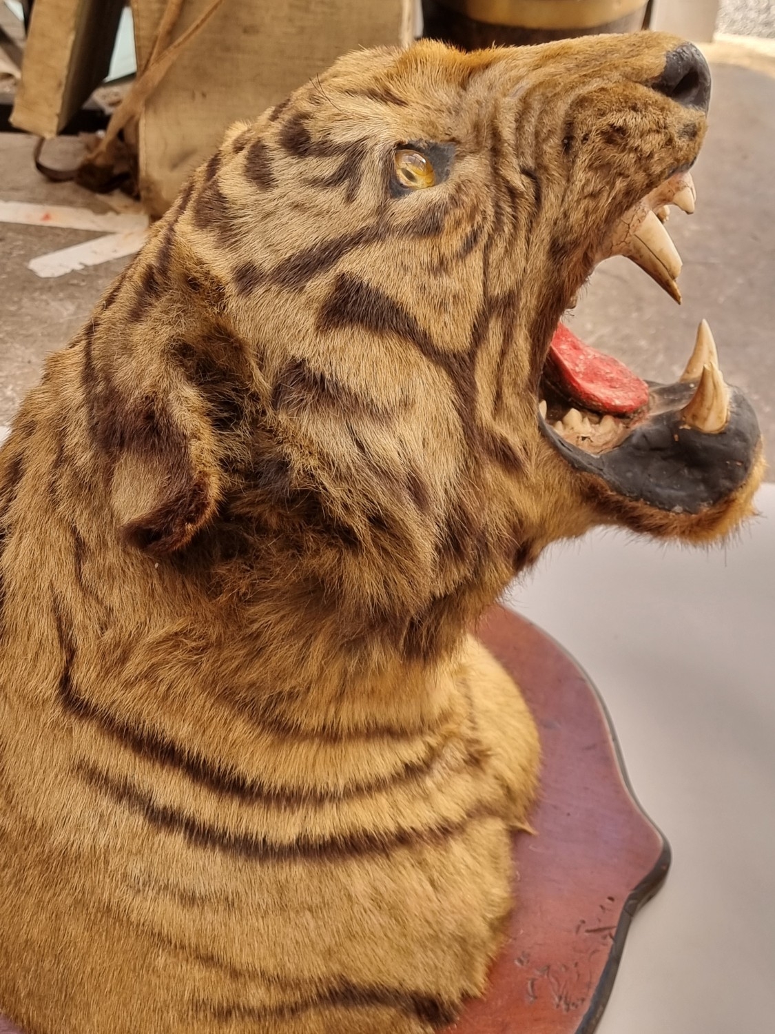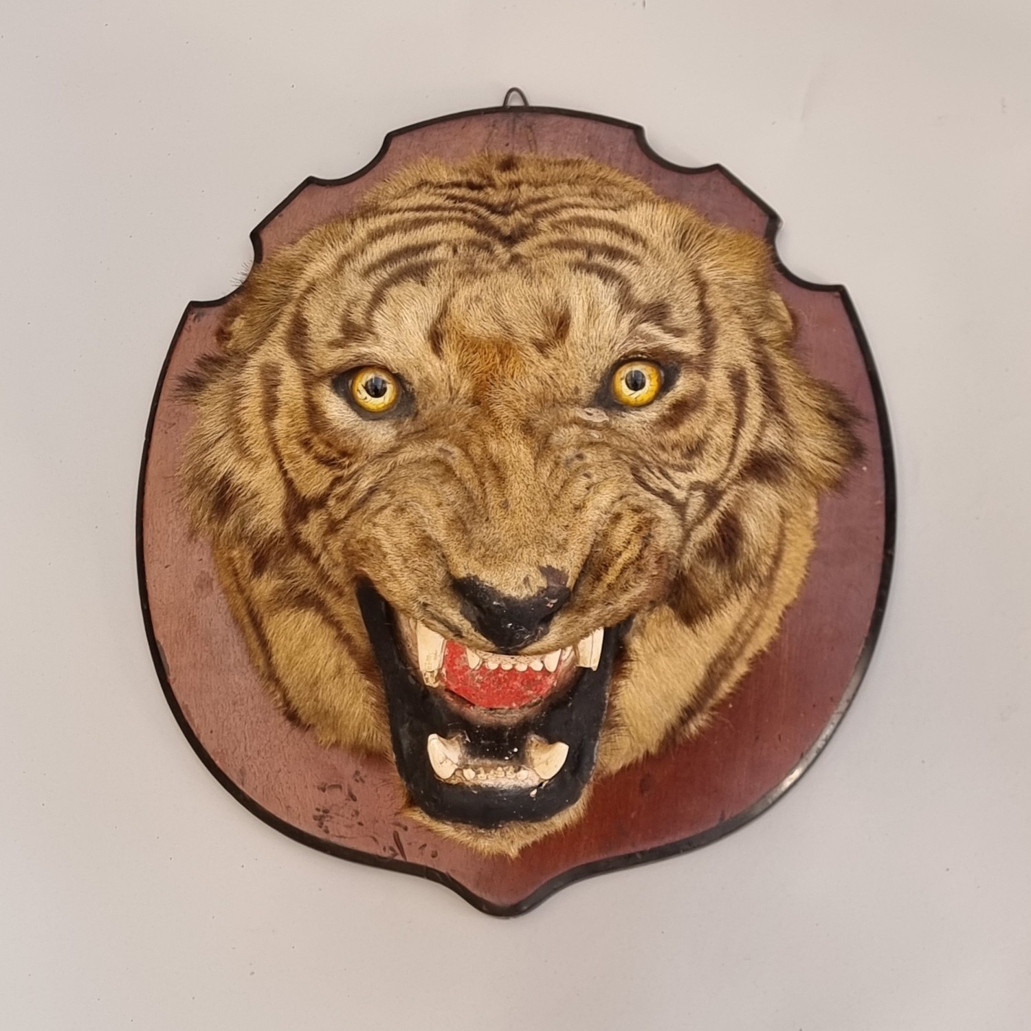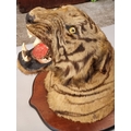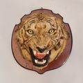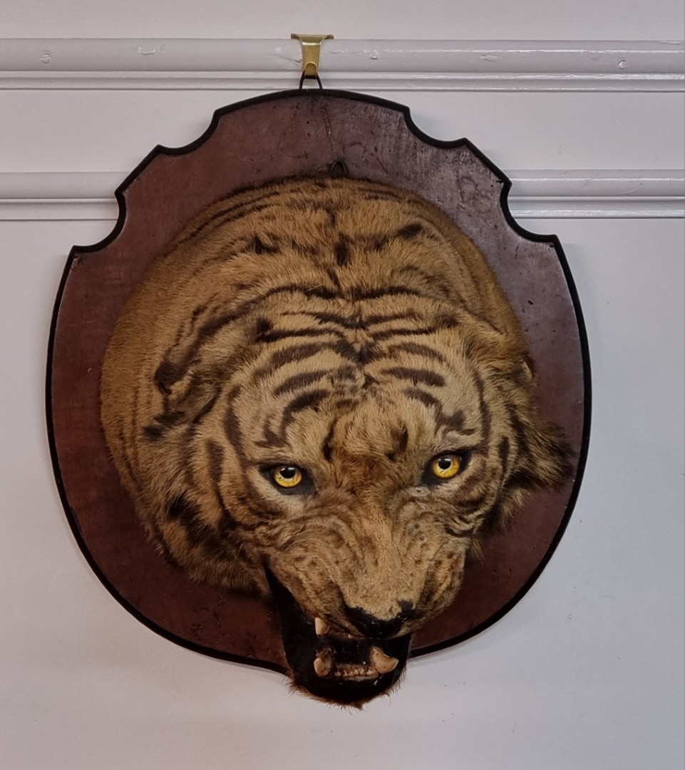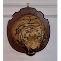 Taxidermy: a large Bengal Tiger head (Panthera tigris tigirs), attributed to Theobald Bros, Mysore, India, late 19th century, on shaped mahogany shield, stencilled 343 to back, height of shield excluding hook 56cm, width of shield, 54cm total depth from wall 51cm, (chips to incisor teeth).