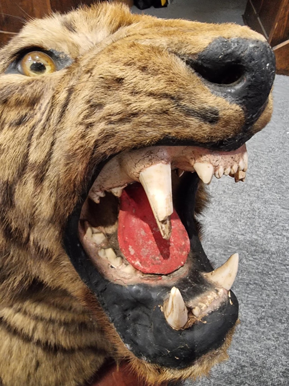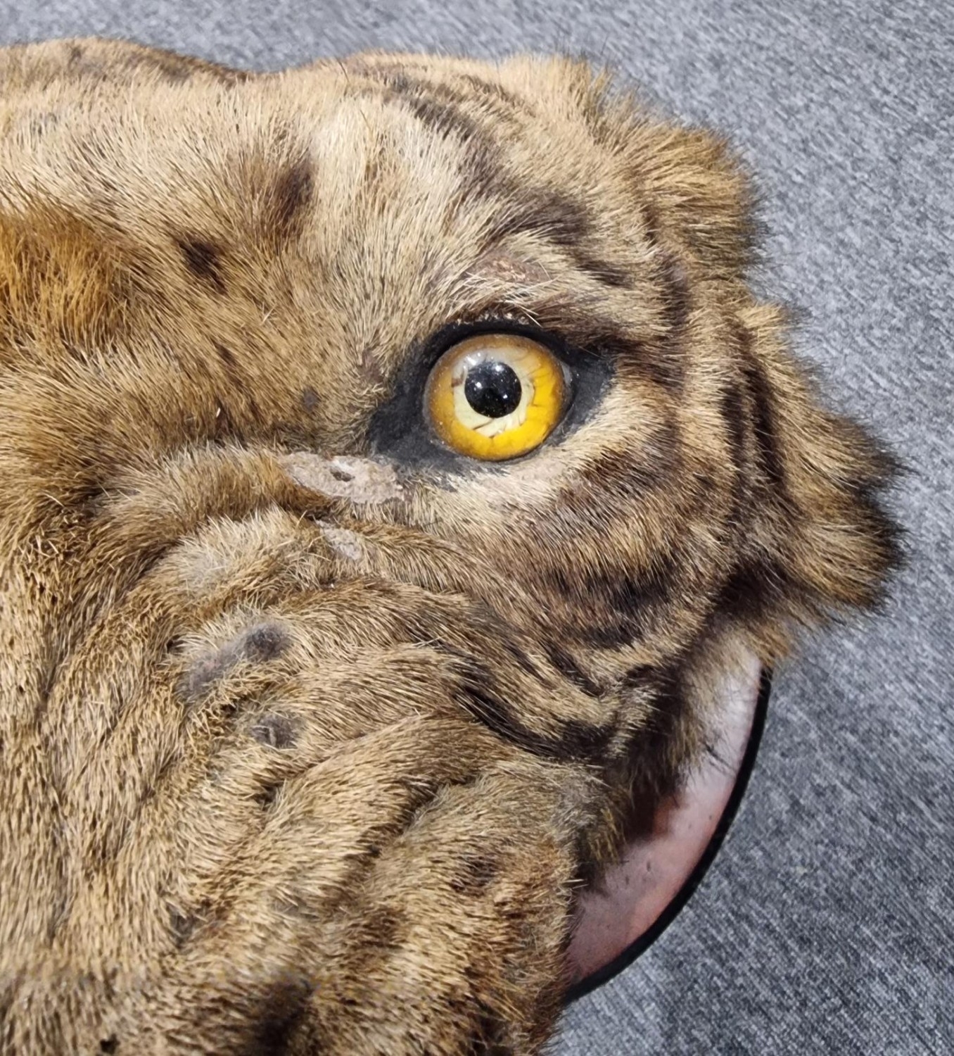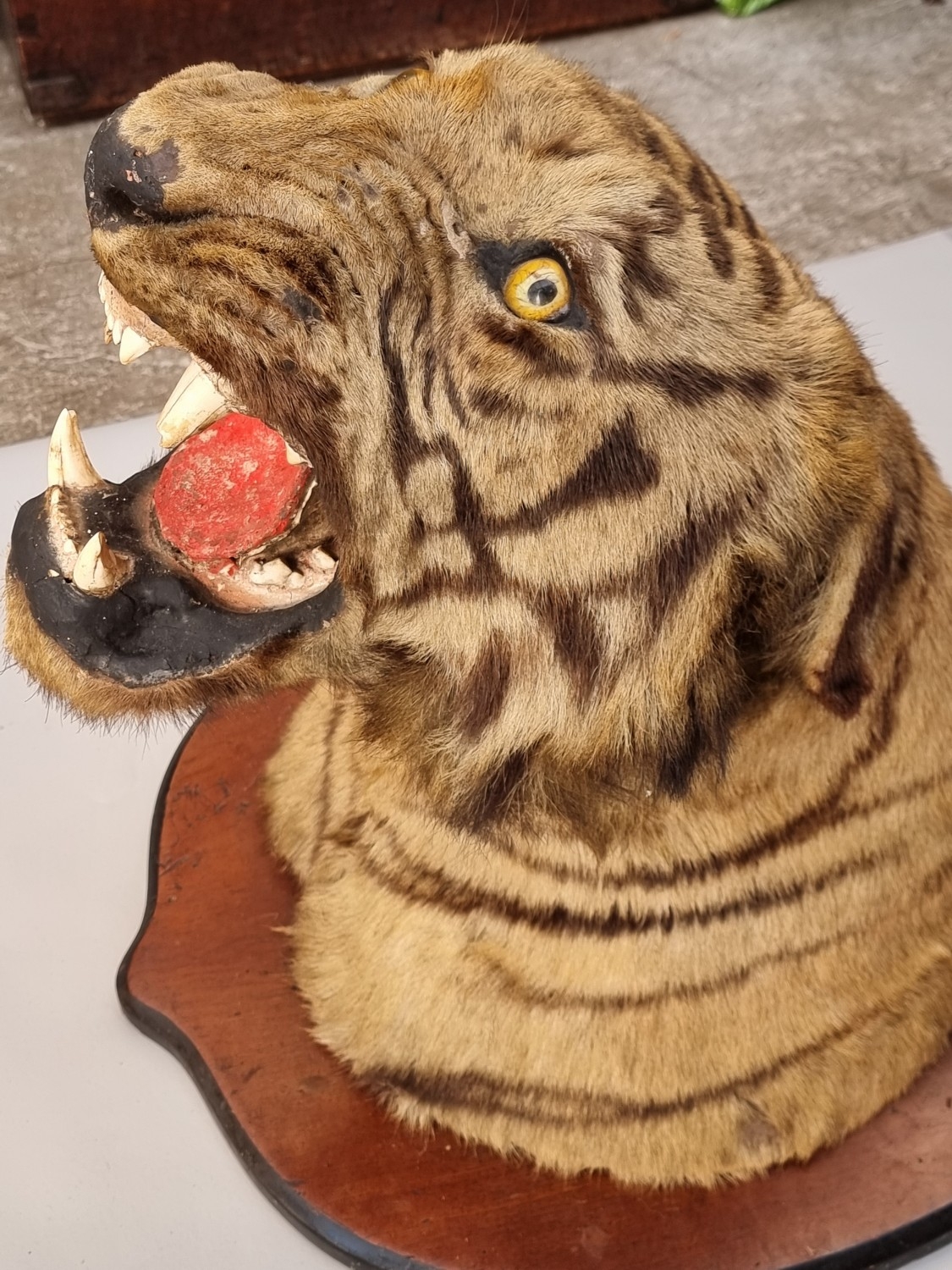 Taxidermy: a large Bengal Tiger head (Panthera tigris tigirs), attributed to Theobald Bros, Mysore, India, late 19th century, on shaped mahogany shield, stencilled 343 to back, height of shield excluding hook 56cm, width of shield, 54cm total depth from wall 51cm, (chips to incisor teeth).
