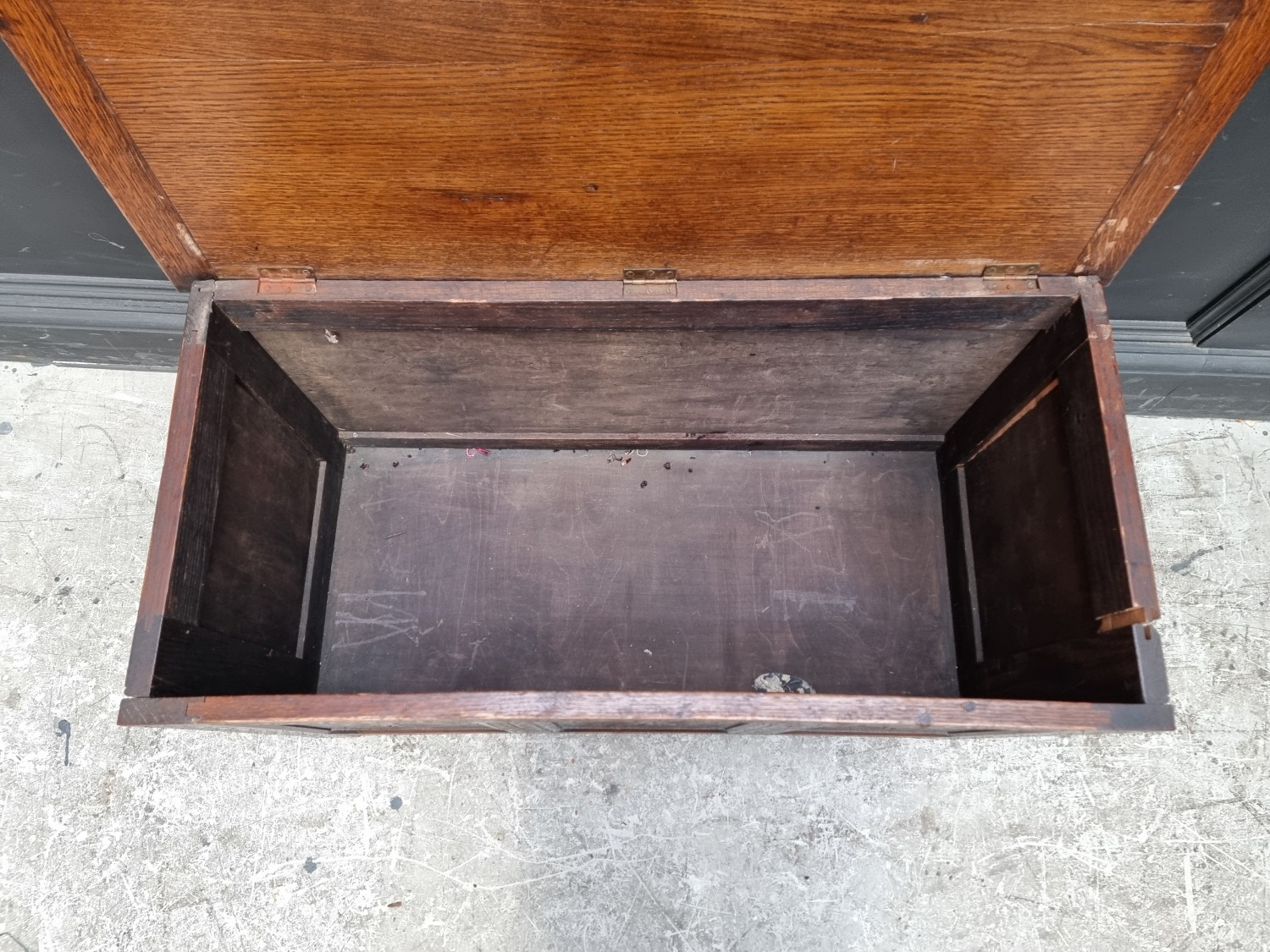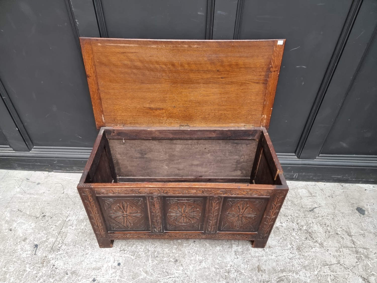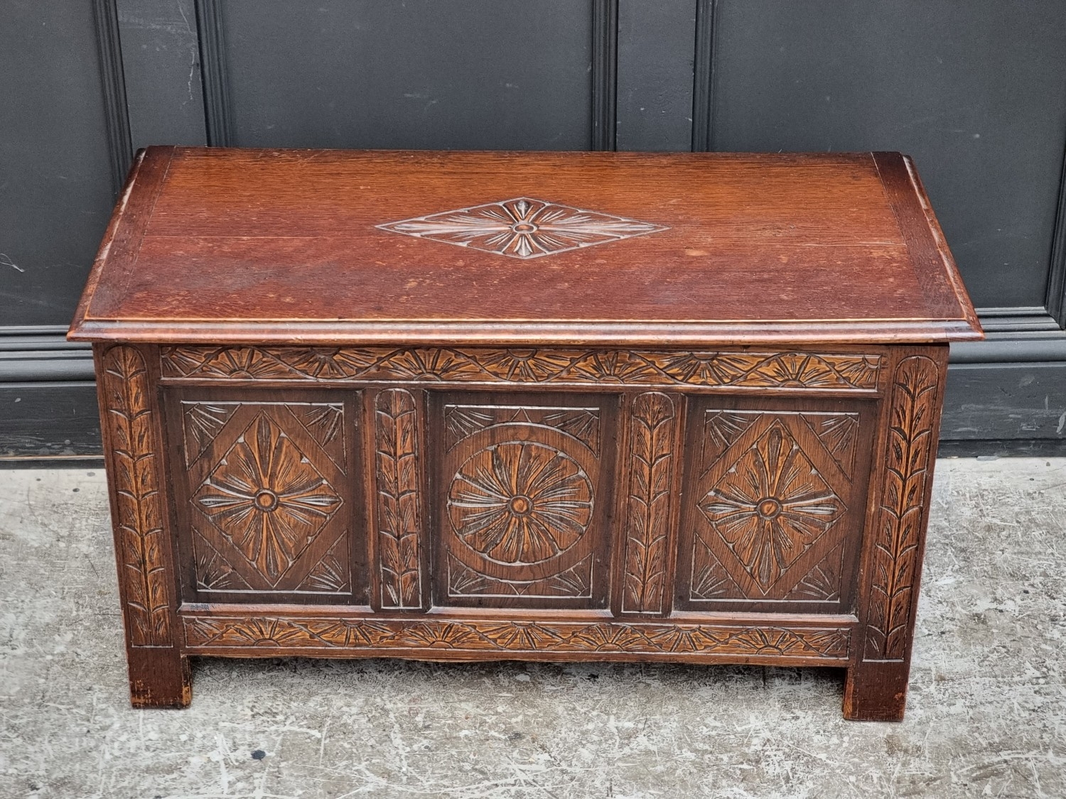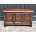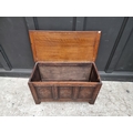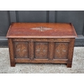 A reproduction carved oak panel coffer, 91cm wide.