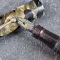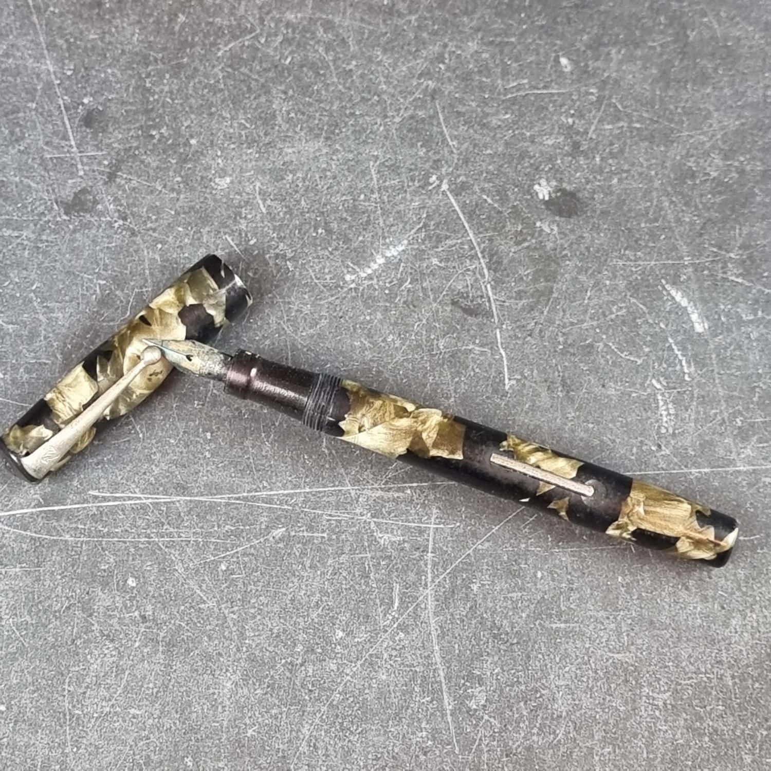 A 1930s/40s Mabie Todd & Co Swan 'Self-Filler' marbled green fountain pen, no band, non-plated fittings, 14ct gold Swan No.2 nib, 12.5cm long.