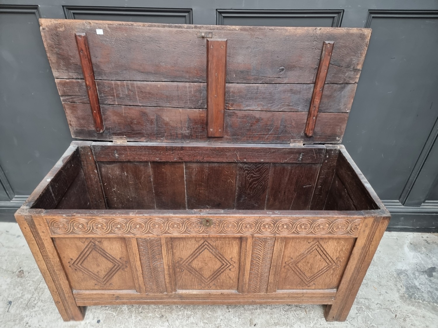 The top of centre sections veneer is lighting and split, otherwise in fair condition.