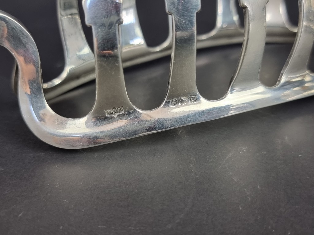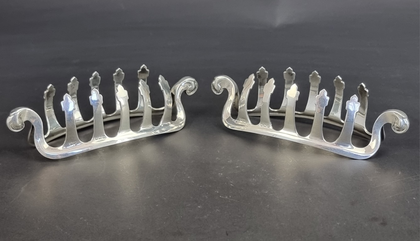 A pair of silver toast racks, by Mappin & Webb Ltd, Birmingham 1938, 15cm wide, 209g.