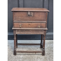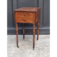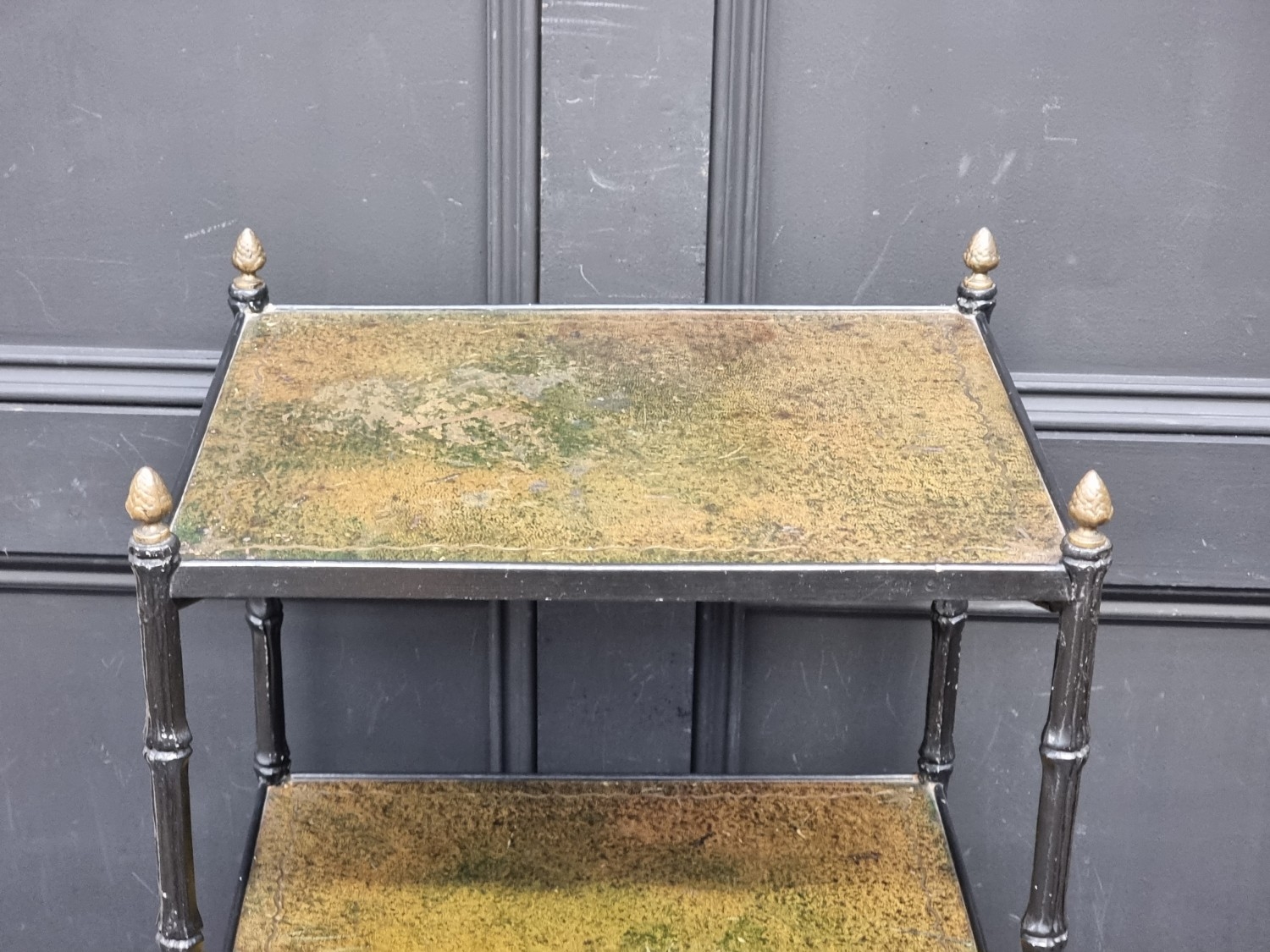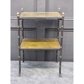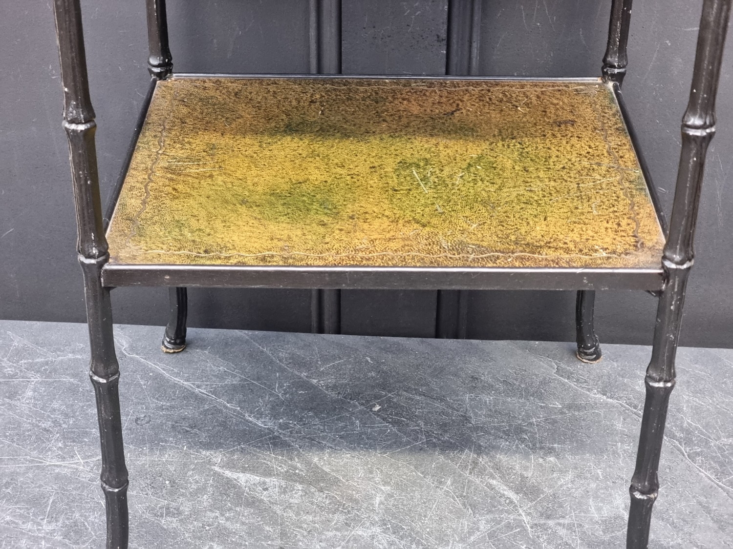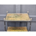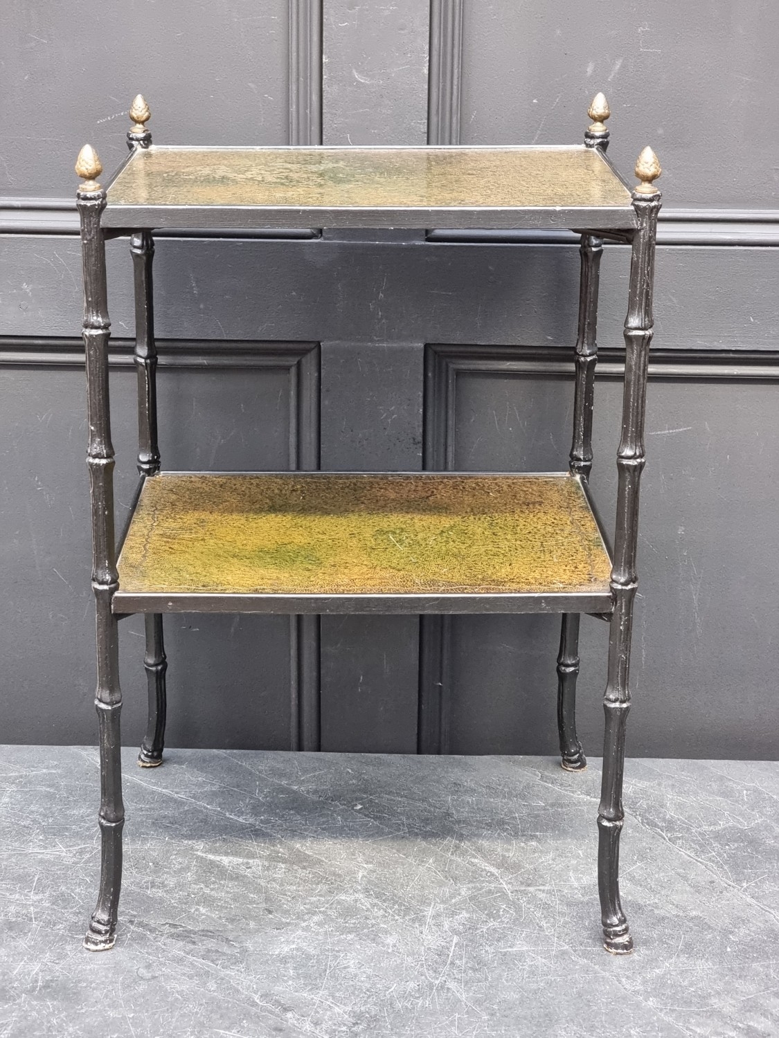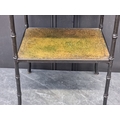 A black painted metal simulated bamboo two-tier occasional table, with gilt tooled green leather surfaces, 63cm high x 42cm wide.