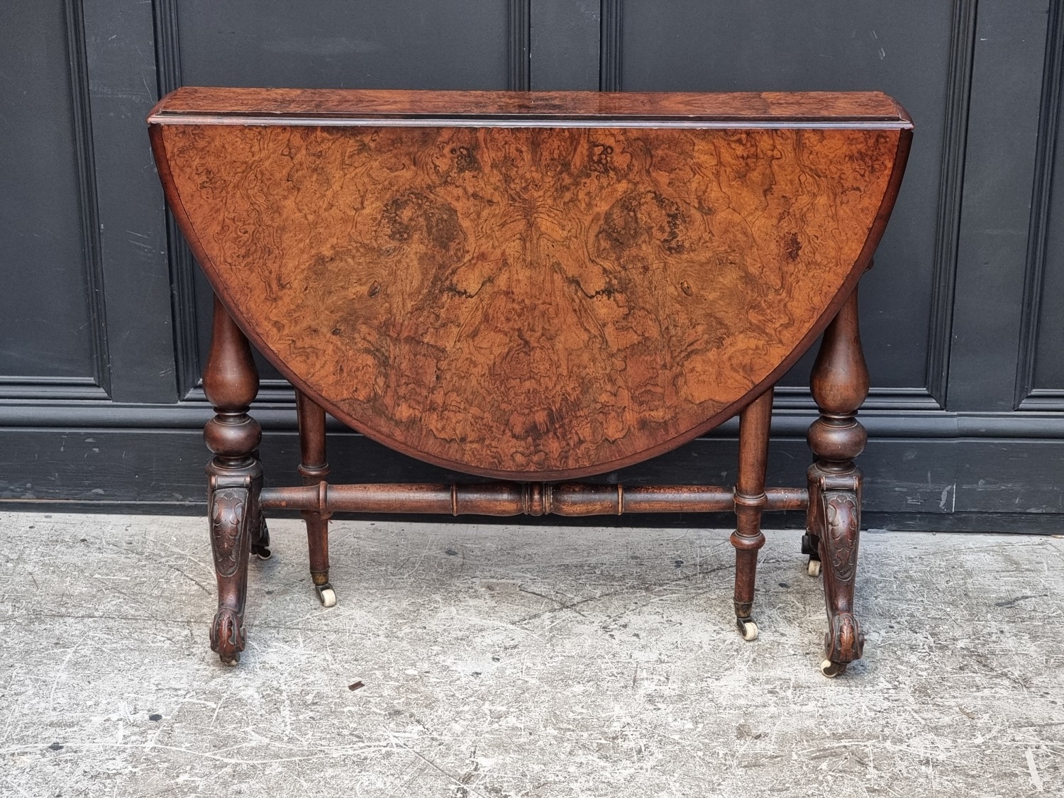 A Victorian figured walnut Sutherland table, 90.5cm wide.