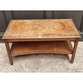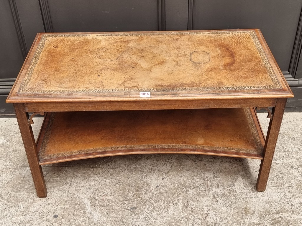 An old mahogany two-tier low occasional table, with tooled leather inset surfaces, 90.5cm wide.